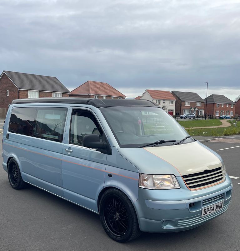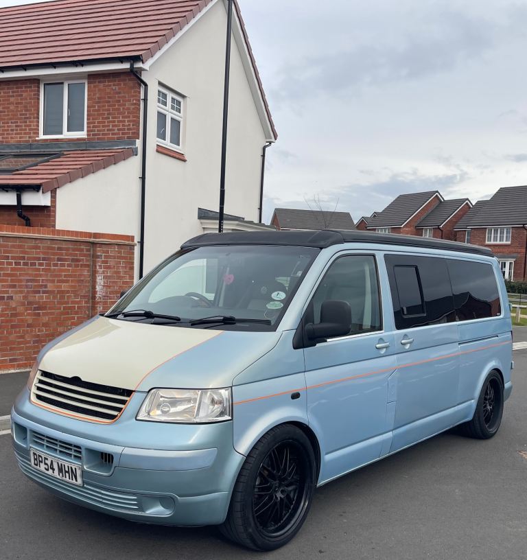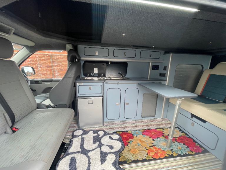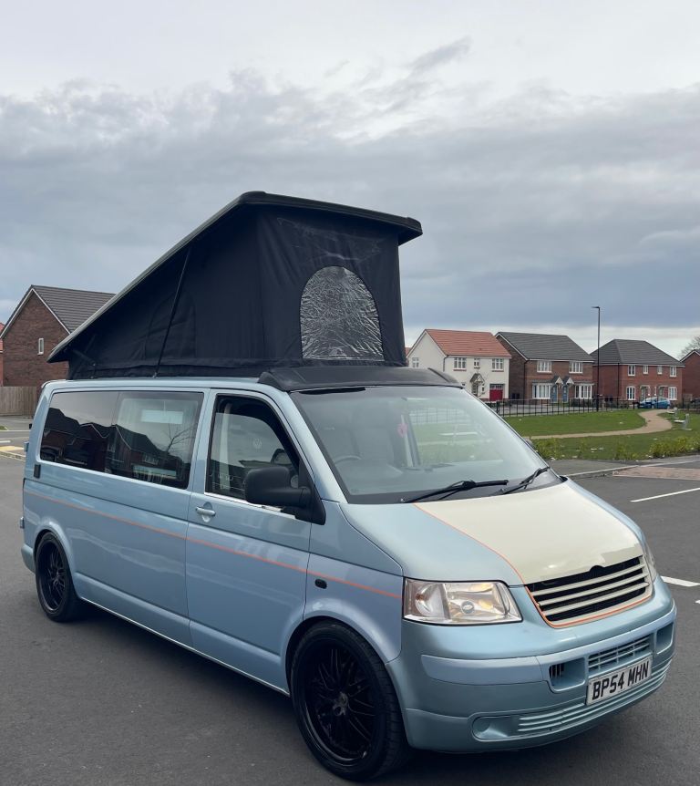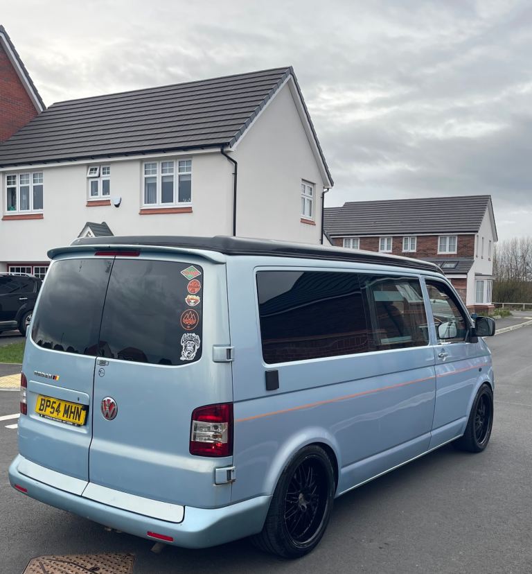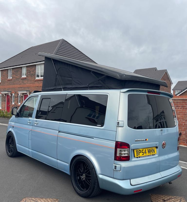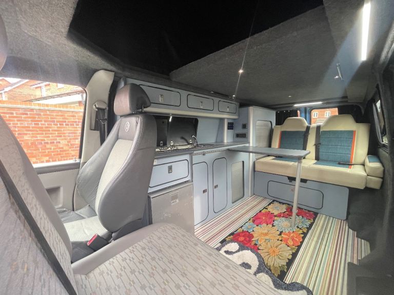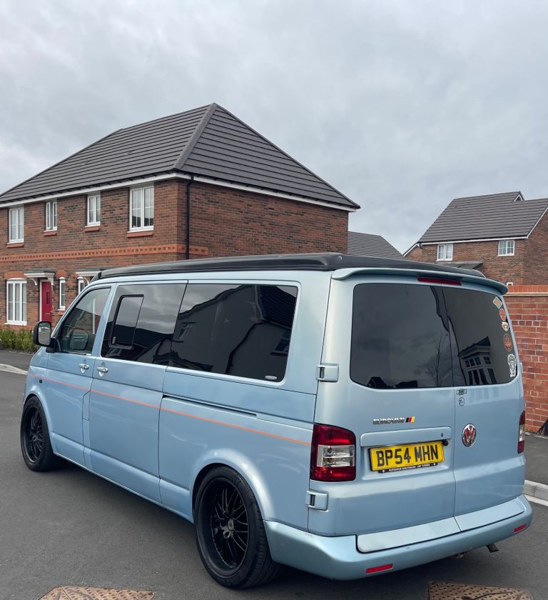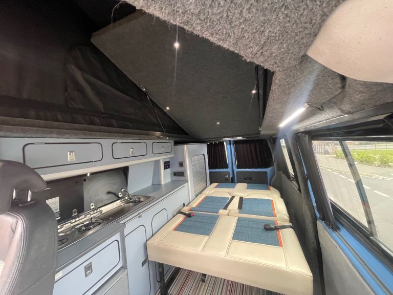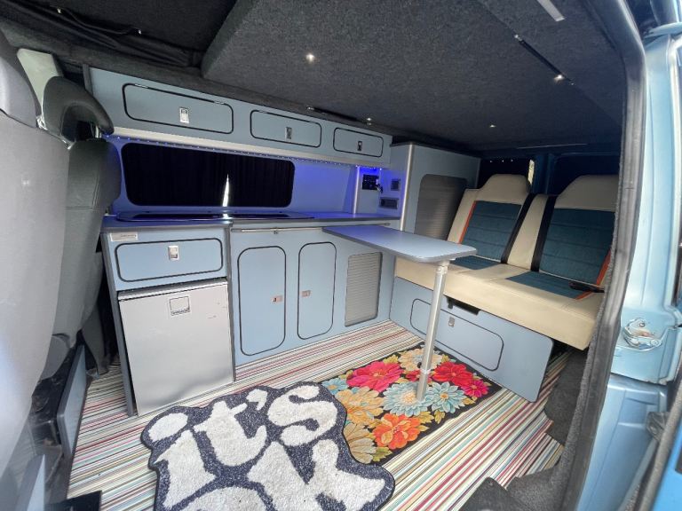 Lovely camper van finished in a unique light blue colour, ready for road trips, weekends away and festivals.