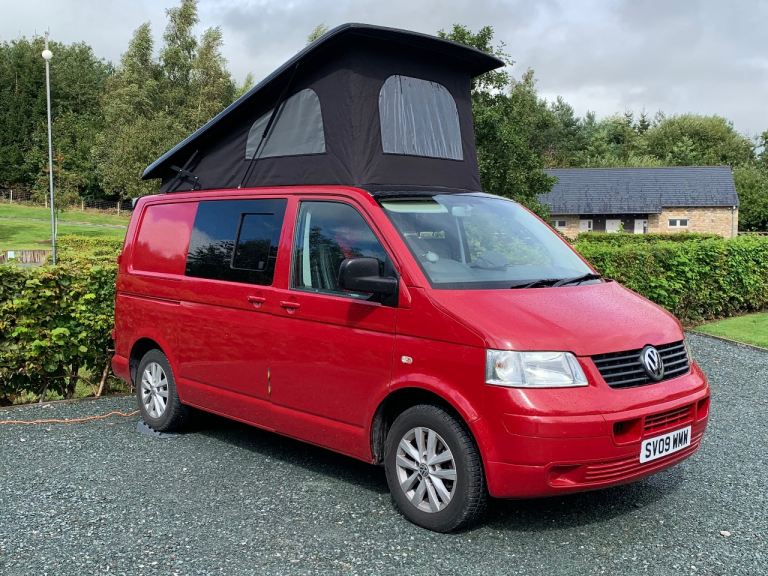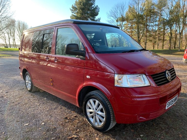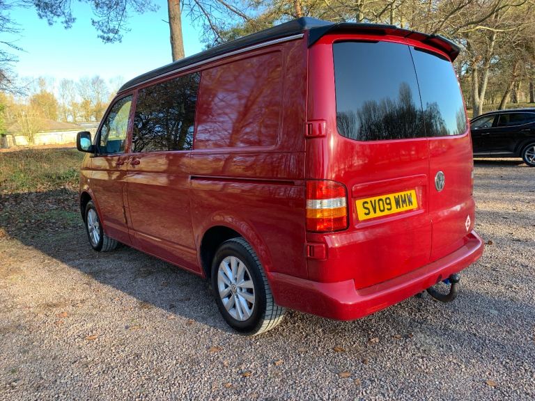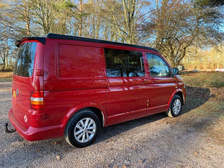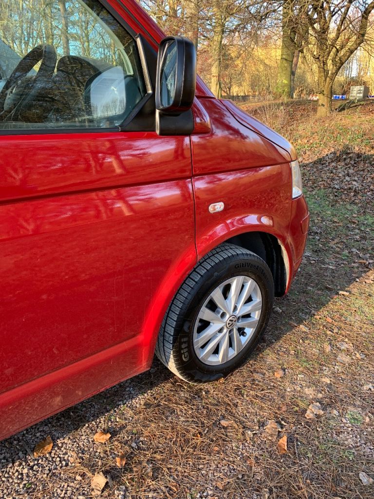 VW T5 1.9 diesel 4 berth camper van, with pop top. 2 ring gas hob with sink, rock and roll bed with 2 seatbelts and under storage, fridge with freezer section, roof spotlights and led running lights and blackout curtains to the mid section. Electric hook up, leisure battery and charger, awning rail fitted, swivel double front seat with storage under, and tow bar with working electrics. All recent MOT advisories have been done, (new brake discs and pads to the front and 4 new matching tyres fitted) plus cam belt and water pump replaced recently.
