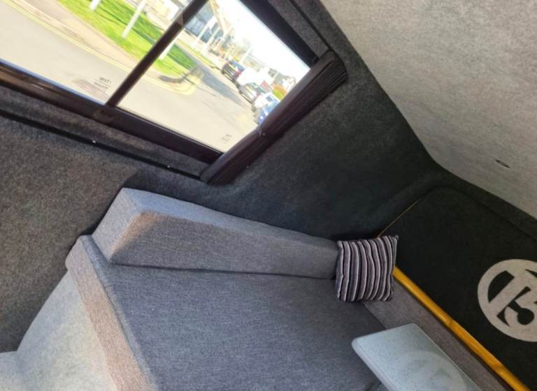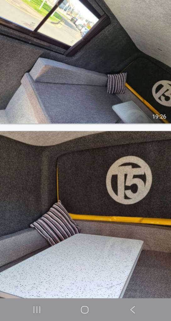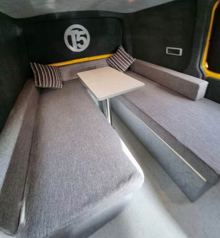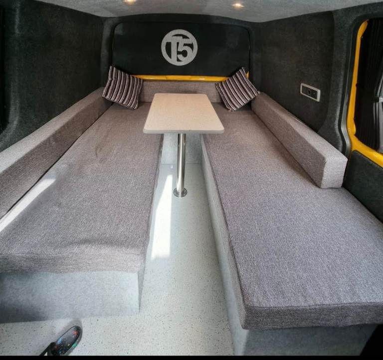 U shaped seating wich turnes in to a large double bed full width of van .