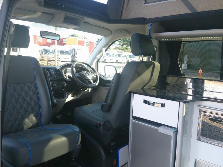 This 4 berth Revolution Ricos Campervan conversion is based on the 2.0 TDI T28 BlueMotion Tech Trendline Panel Van 5dr Diesel Manual FWD SWB Euro 6 (s/s) (102 ps). The layout consists of an elevating roof with a bed, side kitchen, Rock N Roll RIB bed, swivel passenger seat. The spec consists of an inboard water tank, 2 burner hob, grill, 12 volt fridge, sink, control panel, leisure battery, awning, lights, rear sensors, alloys, cab A/C, cruise control., Features Include: 12v socket - additional, 12v socket x2, bluetooth hands free set, composition colour dab+ radio with 5in touch screen, non-smokers package - 12v socket and cup holder in dashboard, usb interface for ipod and iphone, body coloured - bumpers - door mirrors - door handles, abs - anti-lock braking system, airbags - driver and front passenger with seatbelt tensioners and passenger airbag deactivation, automatic post-collision braking system, bas - brake assist system, esp - electronic stability programme, hill hold assist, tcs - traction control system, armrest - drivers, comfort pack, dashboard - dimmable illumination, drivers seat with height - lumbar - reach and rake adjustment, galvanised body, glovebox - lockable, head restraints - height adjustable, height and rake adjustable steering column, interior light, manual sliding door passenger side, rear door interior release lever, tool kit and jack, two door activated interior lights, cruise control, digital clock, driver alert with multi-function display plus, gear shift indicator, parking sensors - rear, power assisted steering, rev counter, 12 volt fridge, awning, control panel, hob, hook up point, leisure battery, passenger air bag, sink, solar panel, under 3500kg, usb points, 2 rear three point seat belts, alloys, battery charger, cab air con, cruise control, elevating roof, fresh water tank, fridge, grill, iso fix, mains hookup, reversing sensors, rib bed/seating, roof bed, smev grill, spare wheel
