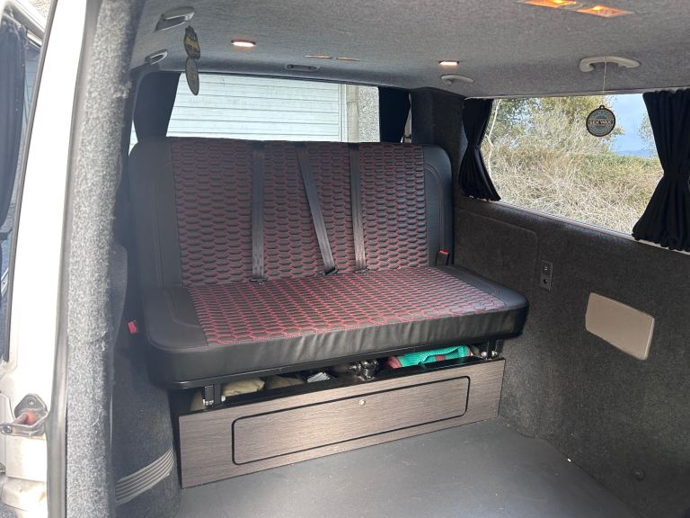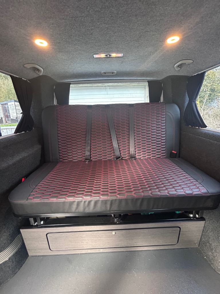 ✔️ Tested electrics + full-size upholstered bed to hex red stitching.