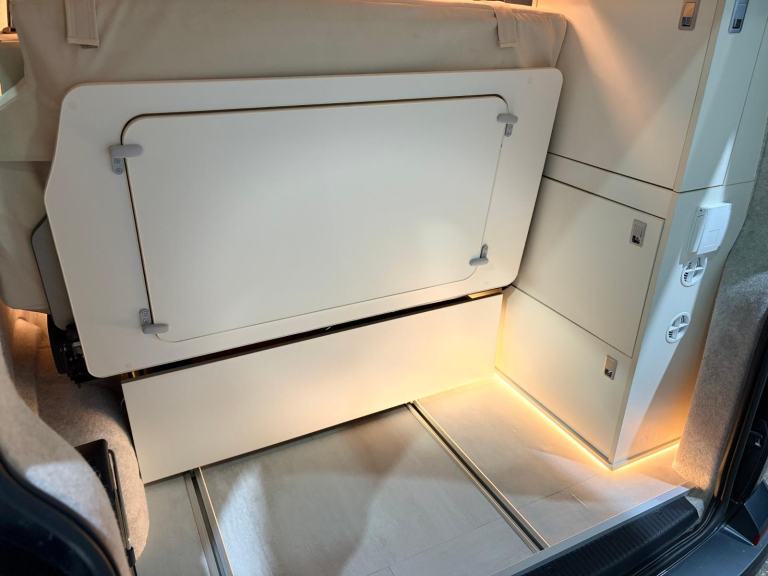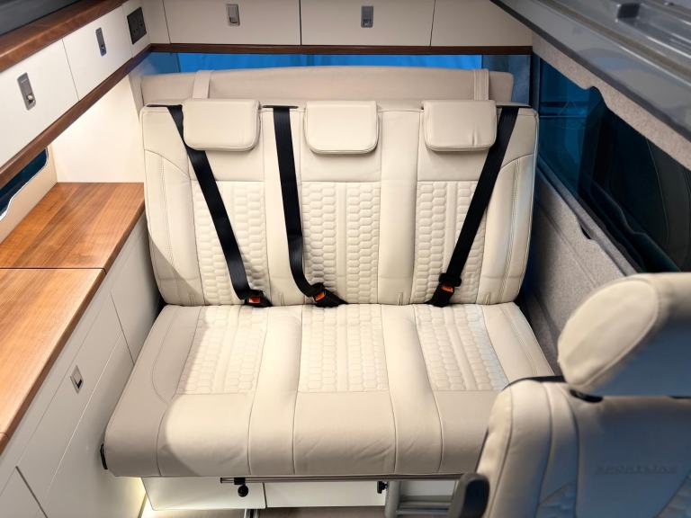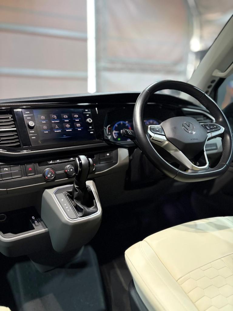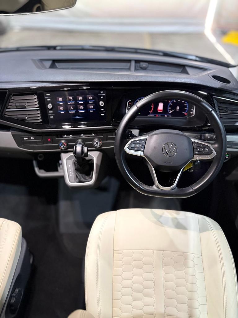 This 2024 Volkswagen Transporter T32 Sportline TDI automatic with a Knights custom campervan conversion is configured with a practical and well-organised layout designed for both travel and day-to-day use. The interior features Sportsline cream seating, including swivel captain’s chairs in the cab and a removable additional passenger seat, allowing flexible seating and living space arrangements. A pop-top roof provides additional headroom and sleeping capacity, while integrated heating supports use in colder conditions. The kitchen area incorporates two fridges, one of which functions as a bucket fridge, alongside an onboard water tank and water heater for convenience. Electrical systems include a 230V battery setup and a roof-mounted solar panel to support off-grid capability. Driving and in-cabin features include cruise control, air conditioning, satellite navigation, and compatibility with Apple CarPlay and Android Auto, all paired with an automatic gearbox rear reversing camera and sensors for ease of driving. Also comes with a removable tow bar.