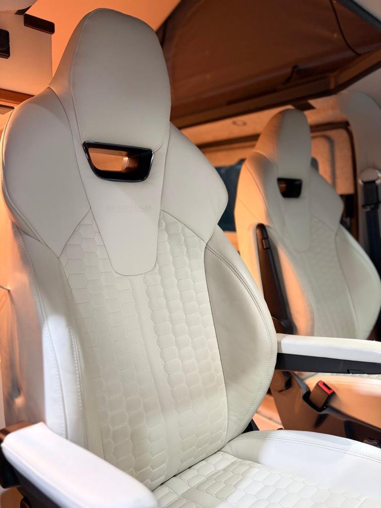 Nappa Premium Smooth Leather Twin Captain Seats with Custom Stitching and Embroidery (matching Seat Bed)