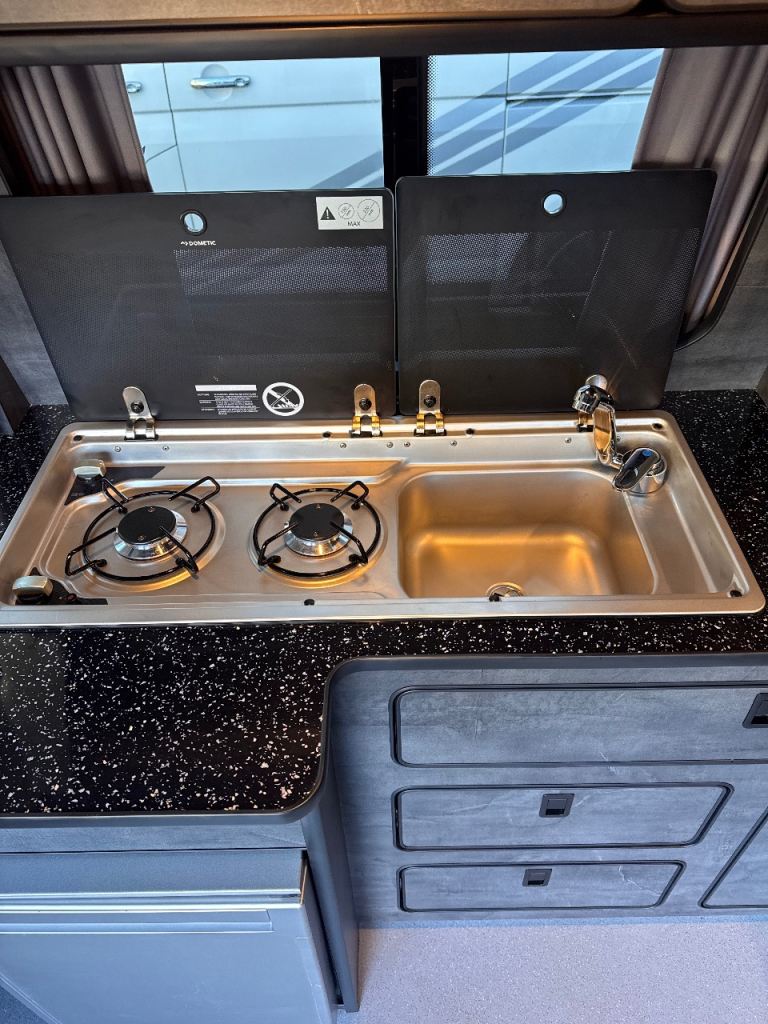 Grey Unit w, black worktops, tambour door, Unit with 9222 twin hob+sink+50l RV fridge/freezer