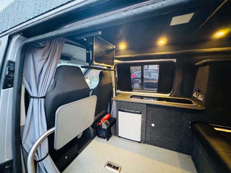• Interior Comforts: Webasto diesel heater with remote control for cozy warmth on chilly nights. Neat slide-out TV that tucks away securely in the bulkhead during travel. Front facelift conversion, giving it a modern & aggressive look. Beautiful rock and roll bed which converts into rear seats.