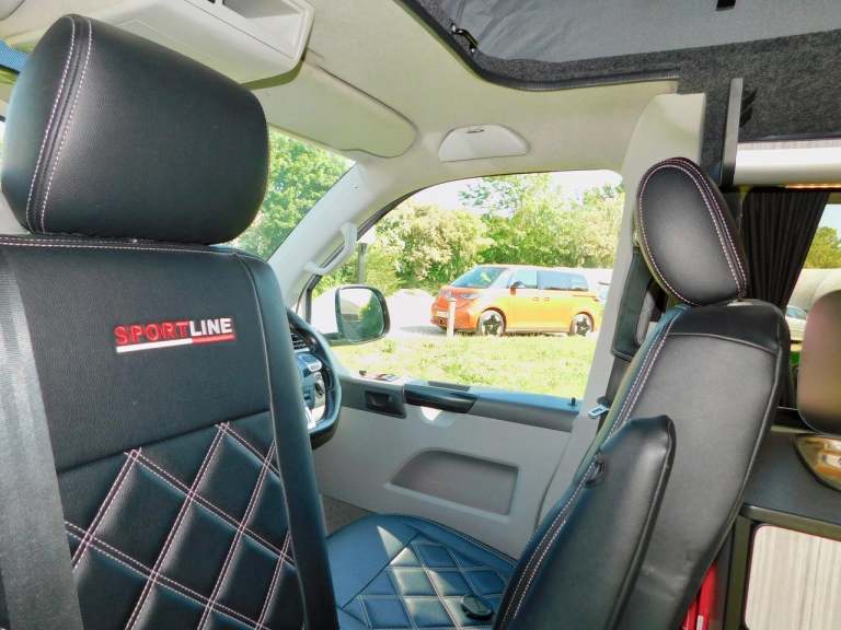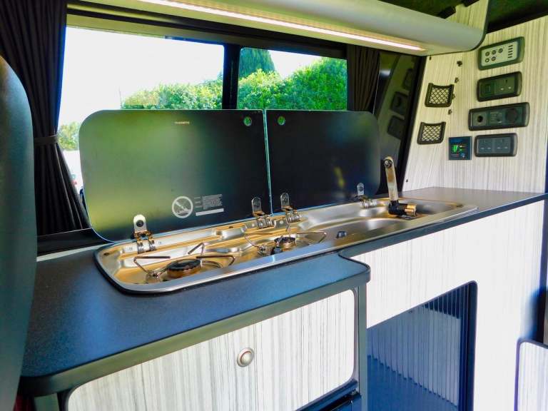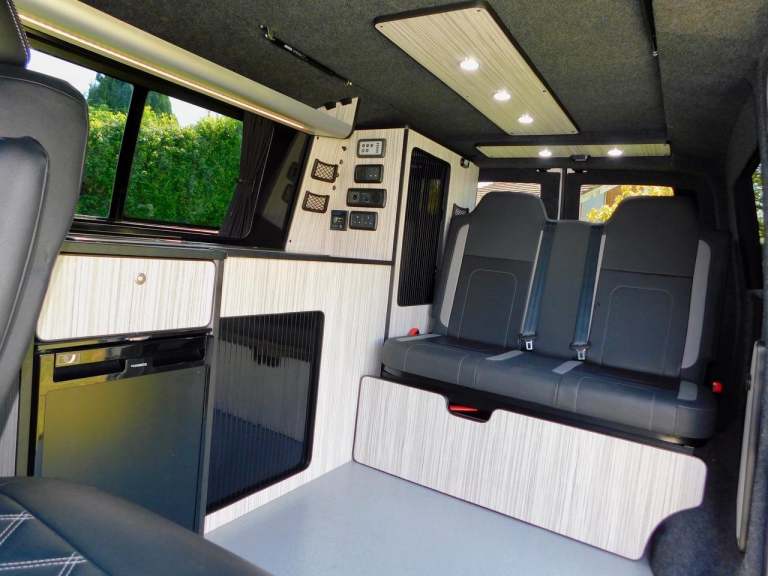 On the Outside we have the Dark Tinted Privacy Glass, Stylish stainless steel Side Bars,Fiamma Wind Out Awning with the White Finish Cassette and Stylish fine silver and grey Awning Fabric. The Colour coded Front and Rear Bumpers and VW badge in the Front Grille, Plus Very Smart multi spoke black 18 Inch Alloy wheels, plus Reverse Parking Sensors. There is also that very smart Colour Coded High Level Spoiler.