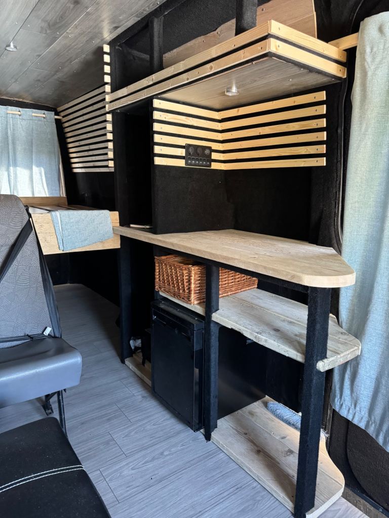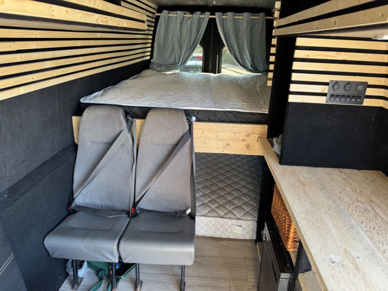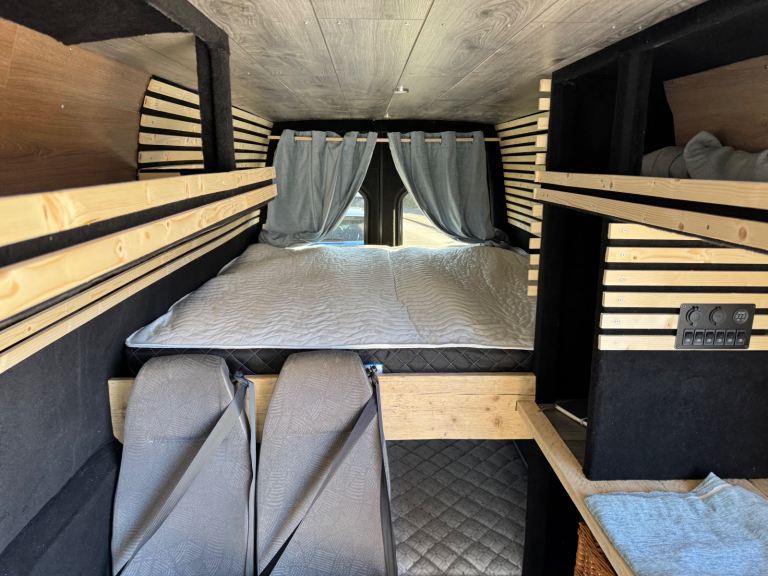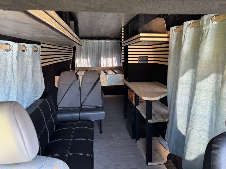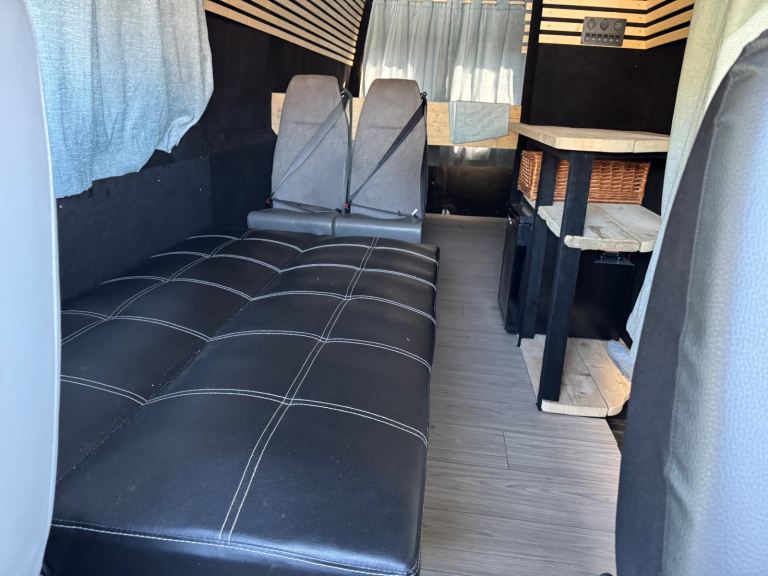 4 berth, with 4 belted seats, 2 singles up front with walk through to rear, 2 in rear