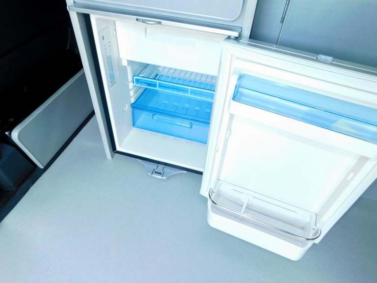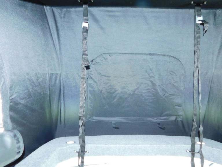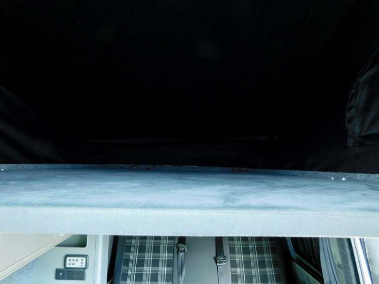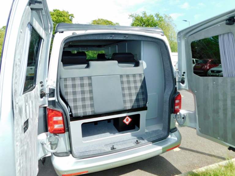 The Rock n Roll Bed is easy to pull out into place and indeed to put back up to a forward facing seat with its 2 x Seat Belts. The Bed when pulled out leaves enough space to get in and out of the Fridge. At the back we have plenty of under seat storage for your bedding etc. Plus we have a dedicated cupboard for your on board Gas Bottle. We also have an additional storage cupboard in this area. The twin rear doors are lined with a stylish light grey Alcantara fabric.