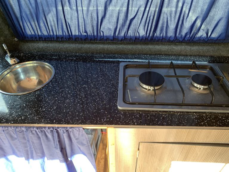 2 ring gas hob, sink with electric tap,