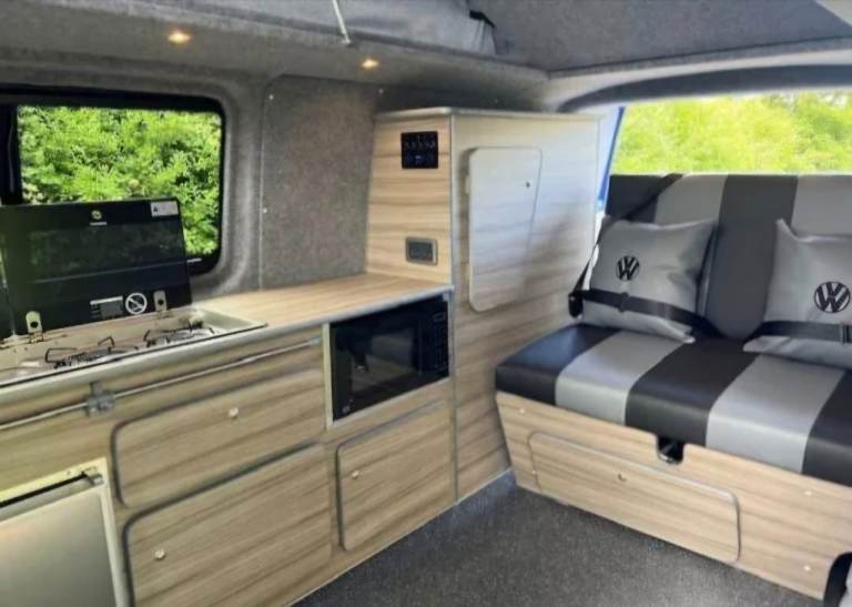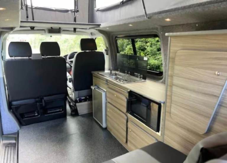 4 birth, 5 seats, rock and roll bed, lots of storage, fridge, 2 gas hob, sink, microwave