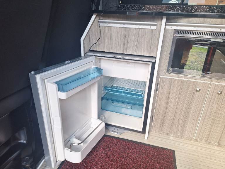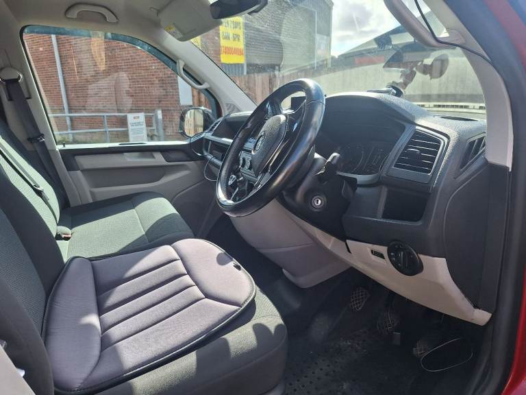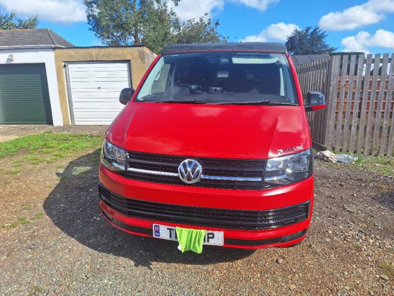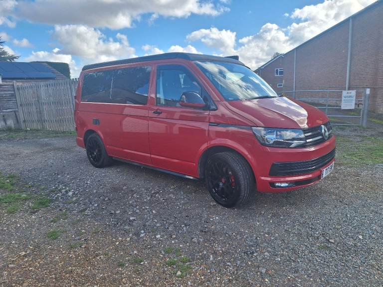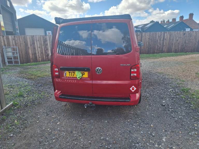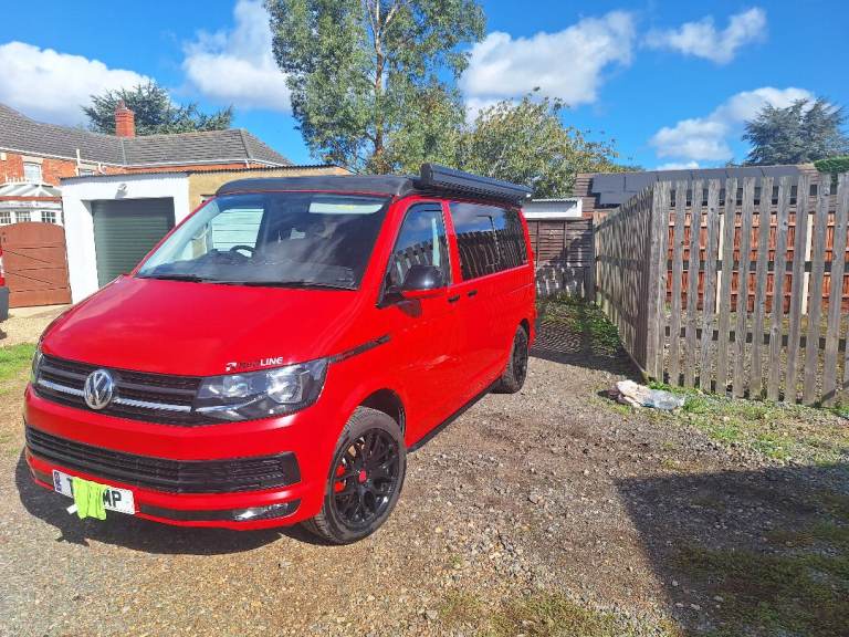 2017 vw t6 campervan full service history 51350 miles Cambelt water pump replaced at44000 usual kitchen lay out on board water tank and interior diesel heater recently refurbished black alloys and black side bars with pop top air con cruise control tow bar converted by redline in red with grey interior