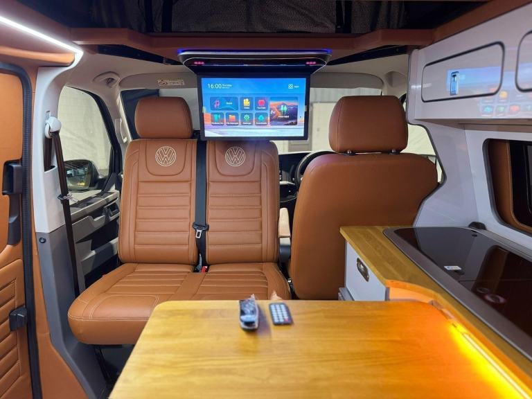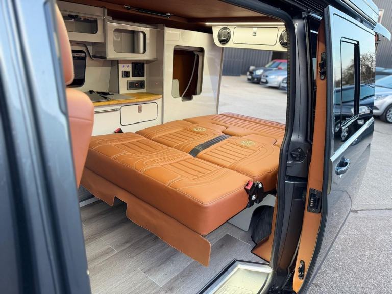 Motorhome Depot are proud to present this low mileage 4 berth / 5 seat belt Volkswagen T6.1 Highline in Indium grey metallic, first registered in November 2022 as a 22 plate, it has a manual gearbox and has covered just 9072 miles from new and also has the benefit of a full Volkswagen service history. The Indium grey metallic exterior is further complemented by the 18" Palmerston gloss black alloys with polished face, the colour matched STORM pop top along side the Fiamma F45s awning in deep black and the Indium grey tailgate spoiler.This isn't just any conversion, it's a well thought through, high quality build with a stunning full tan leather interior which really makes this conversion stand out amongst others, further highlights include an Alpine design premium kitchen area in light grey gloss with a real oak worktop and occasional table, two burner hob and sink,under counter fridge with freezer compartment.M1 crash tested rock & roll bed, M1 crash tested double pull out swivel for front passenger seat, 19.5" flip down smart TV, 2Kw Webasto heating system, privacy blinds to all rear windows, Blaupunkt 3022 M Multimedia system in the rear, Alpine 240W speaker system with TV connectivity, LED lighting.Finally in the cabin we have full leather heated front seats, VW audio system with built in reversing camera, front and rear parking sensors, cab air conditioning, cruise control, electric mirrors and windows and full LED front running lights and LED tail lights.This van really does need to been seen to be fully appreciated, located in NG16 Nottinghamshire.Please get in touch to view the additional photos. Motorhome Depot West Leicester would be delighted to arrange viewings of this campervan. All our vehicles are HPI checked, and a full demonstration of the vehicle will be carried out on handover.