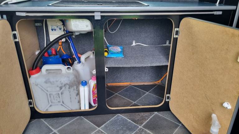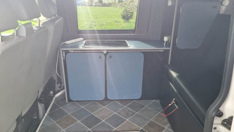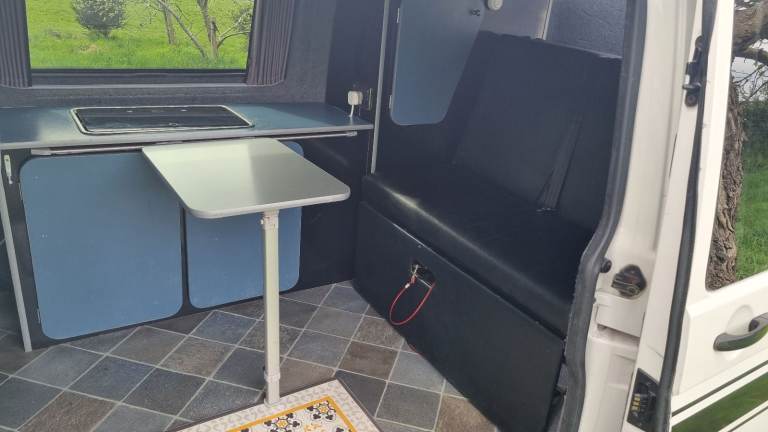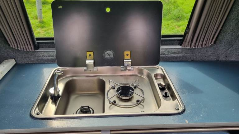 The Rock n Roll bed sleeps two adults and the van is equipped with kitchen area with fully working sink, gas cooking hob and running water tap. Lot's of storage cupboards too!
