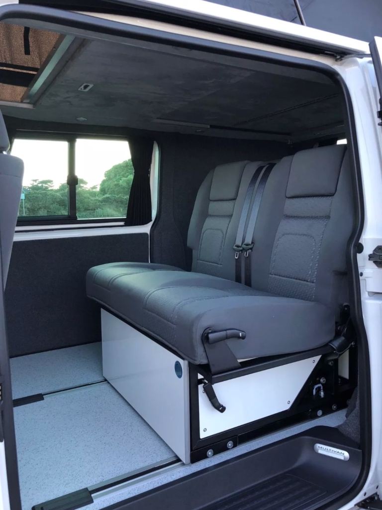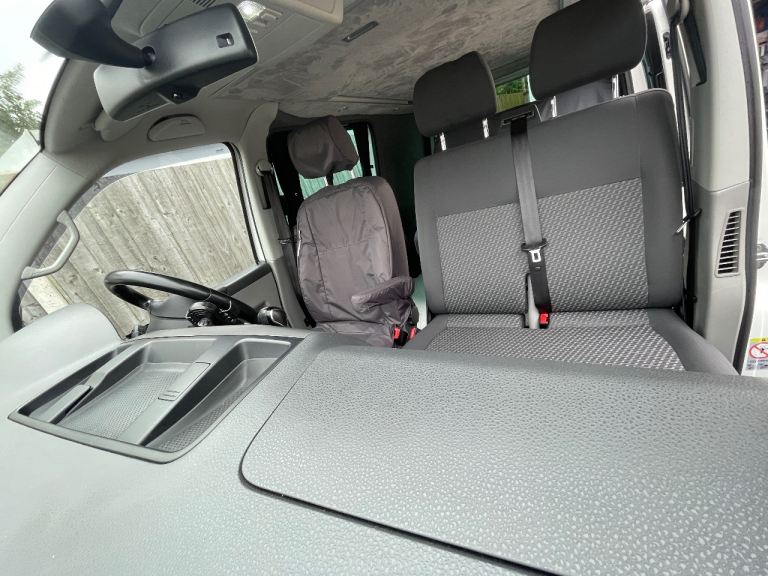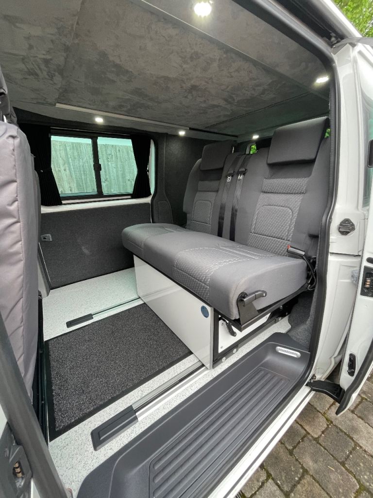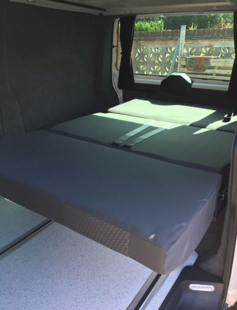 Uberbus unique flux Rib bed conversion, in matching grey tassimo trim, comprising of new floor/side step and genuine VW rails, allowing the bed to move and lock every 12mm allowing up to 1.5m load space behind, M1 crash tested, fitted by uberbus in Poole. This will come with a memory foam fitted mattress. Super comfy!