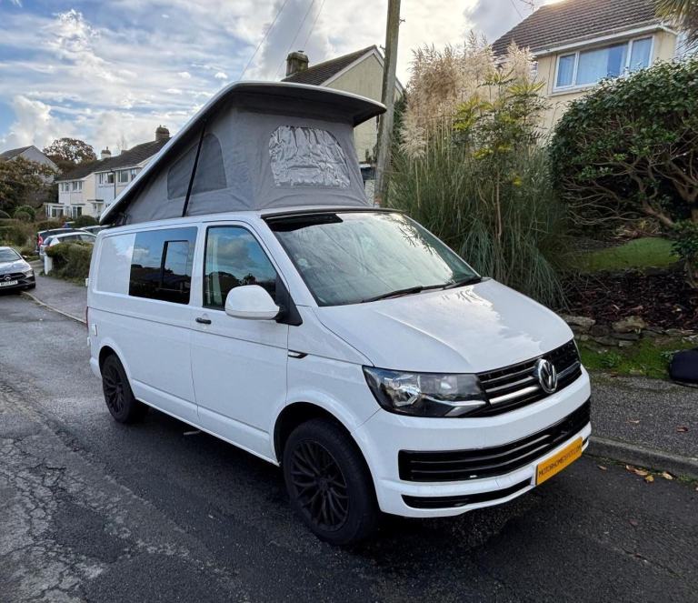 Motorhome Depot Cornwall are pleased to present this Stand Out 2018 Campervan Factory Conversion VW T6. Campervan Factory have over 15 years experience and are a specialised conversion company who pride themselves in delivering high quality T5/T6 van conversions and this camper is a great example of the quality they deliver and you can see the great attention to detail taken here. This Camper is Euro 6 compliant, It is powered by a 2.0 Litre TDI Diesel Engine with a 5 speed manual gearbox. Stylish and luxurious this conversion is one that will not limit you on where to go and what routes to take at just 4.9metres in length. A perfect choice if you are also looking for something that can be also used as a leisure vehicle. You can also sleep up to 4 people and travel up to 5 people at any one time. This camper has some great features and extras, which include; Webasto Diesel Heating for the Living Area, The Well Desired Cab Air Con, Pop Top with Sleeping Area, 2xKeys, Plenty of Storage, 240 Hook up Point, Small Gas Bottle, Modern Radio, Central Locking, Electric Windows and Mirrors, Reverse Sensors, Leisure Battery, Fridge with Small Freezer Space, Table for the Living Area, Alloys, Cold Water Unit, Gas Hobs. Swivel Front Double Seat, 240 Sockets in the Rear, Black Out Curtains, Full Control Panel and more! In short, this is a lovely camper, done to a very high standard which is ready to go on its next adventure. Weight – 2800KG and can be driven on a standard licence MOT due – October 2026 HPI Clear Location – Falmouth/Cornwall with local Train Station pick up available if needed. To see a more extensive file of photographs, walk around video or ask any questions and book an appointment for viewing please call or email Stefan and Alex on [Phone number removed]or email [Email address removed. Click Email button to contact us.]