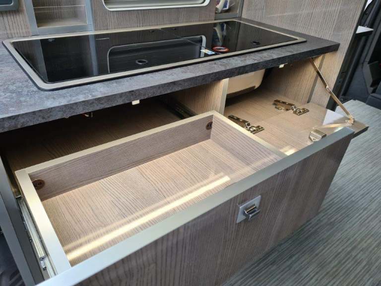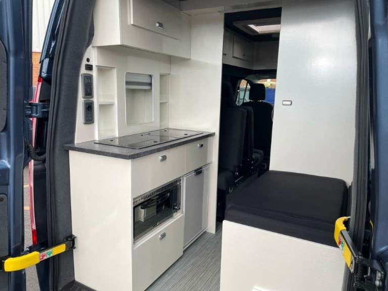 This is the same layout as the LUX XL 2 which we have built for many years. Please note the spec is subject to slight changes until we have built the first one. Dometic ceramic bowl cassette loo. Roof-mounted lockers and Heki rooflight. Driver and passenger swivel seats. Side settee that forms a 1.60m x 1.26m bed (extendible to 2.01m with cab seat bases) Option of 2 x single rear belted seats that make up into 2 x single beds (£2000) Option of sliding rear double seat than folds down into a double bed (£2500) Freestanding dining table. Vitrifrigo 42ltr slide out fridge. Separate two-burner hob with extractor fan. Separate sink with flush-fit lid. German Webasto 2kw heating. 120w Solar panel and 100Ah leisure battery. Rear blinds on all windows. LED lights. Mains Lead & gas bottle included.