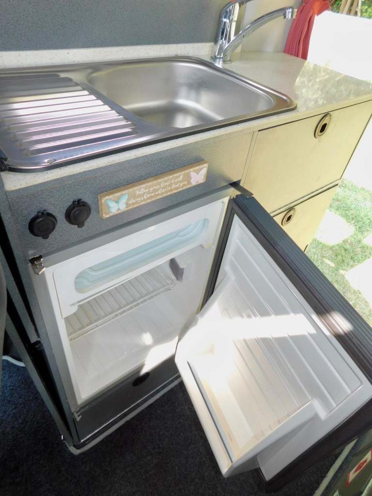 Rear KITCHEN with Complete with 2 Burner Gas Hob, Fridge with small ice compartment, Sink with Electric Tap. We also have a large capacity Fresh Water Tank, and Storage Cupboard with a brand-New Porta Potti TOILET. Plus ample further Storage cupboards all round.