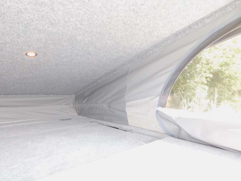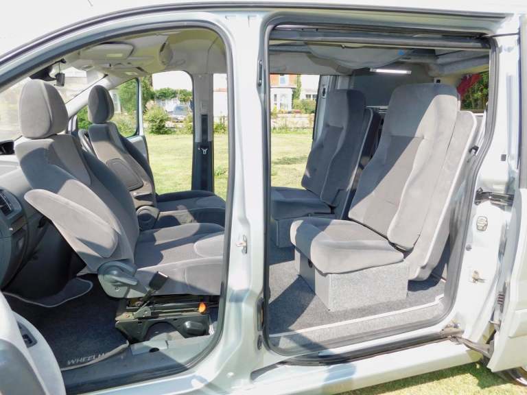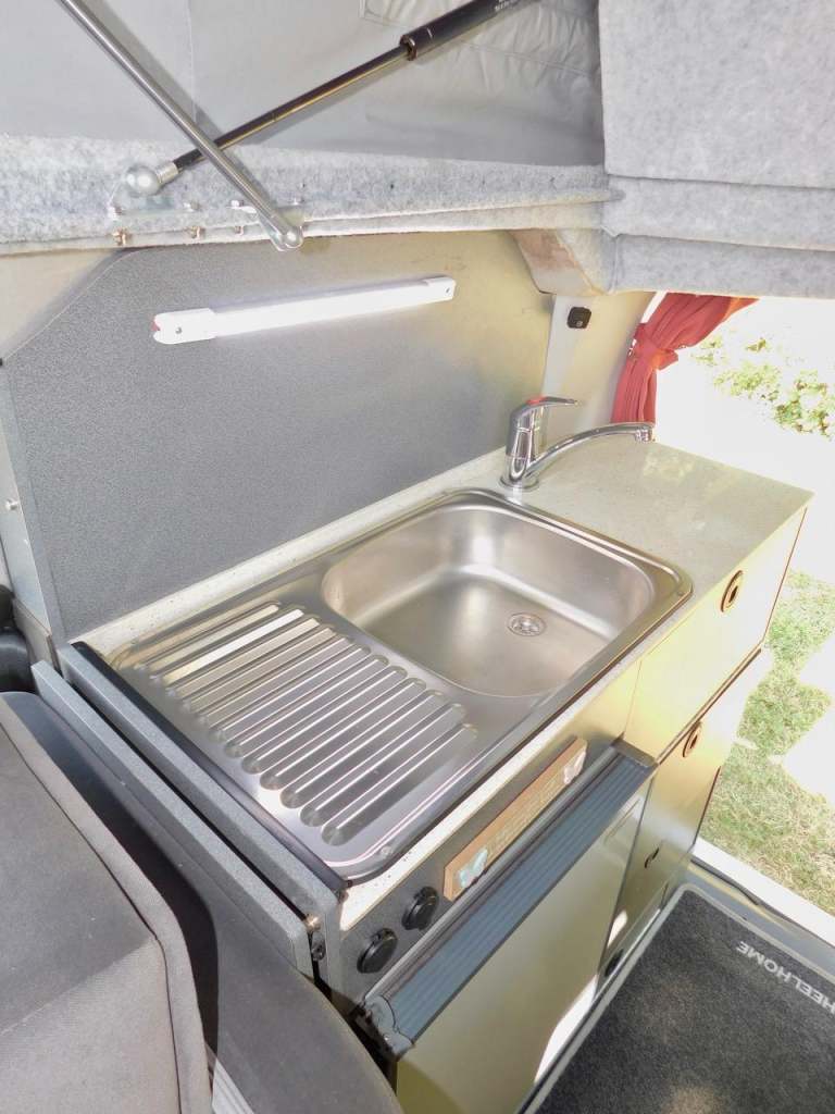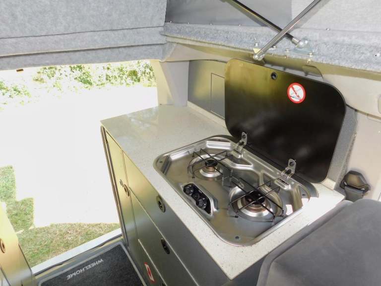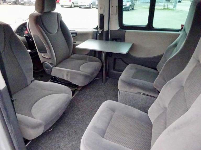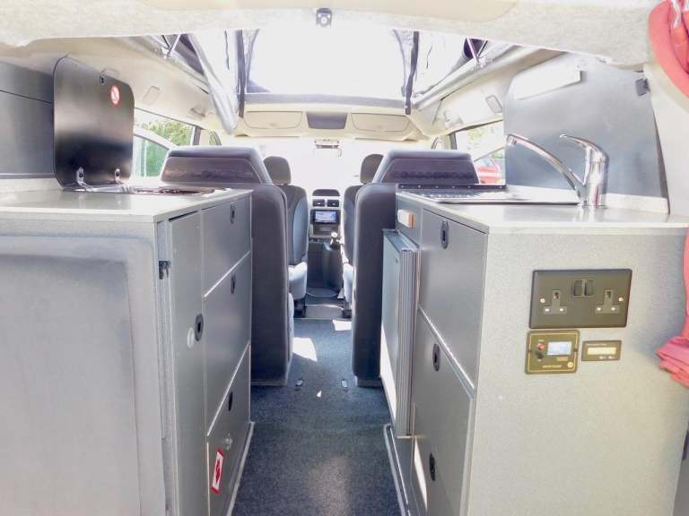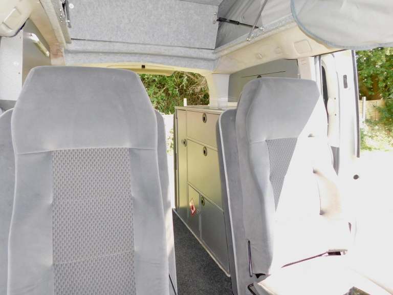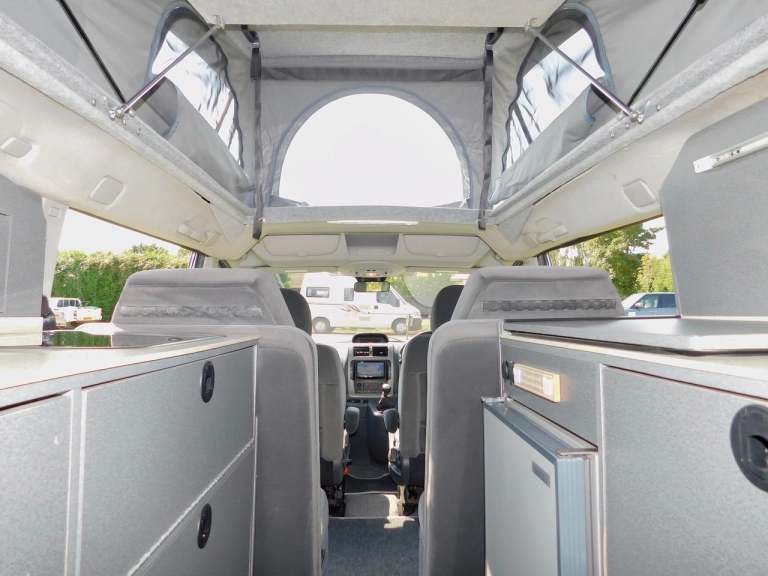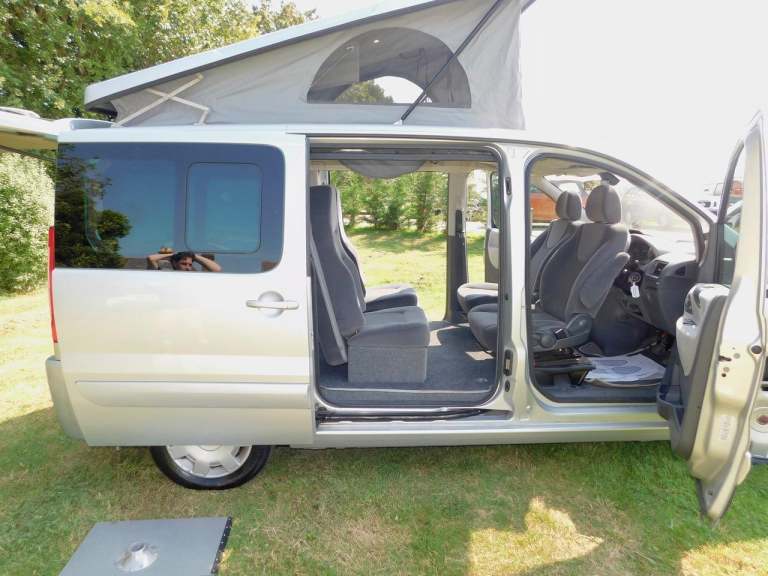 The Two Front Captains Seats SWIVEL to face the two Rear Seats to create the Lounge and Dining area with its choice of Folding and Removable Tables. Both the side doors slide to ease entry and exit. The LOUNGE then easily converts to 2 x Single Beds with a walk through to the Kitchen and Porta Potti Toilet. Additionaly you are also able to make it up as a Large DOUBLE Bed. We also have an external 240v Hook Up point to keep the leisure battery topped up. The Pop Top is easy to Open and Close by One Person.
