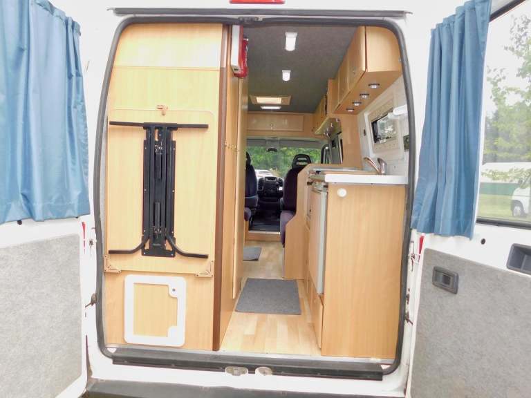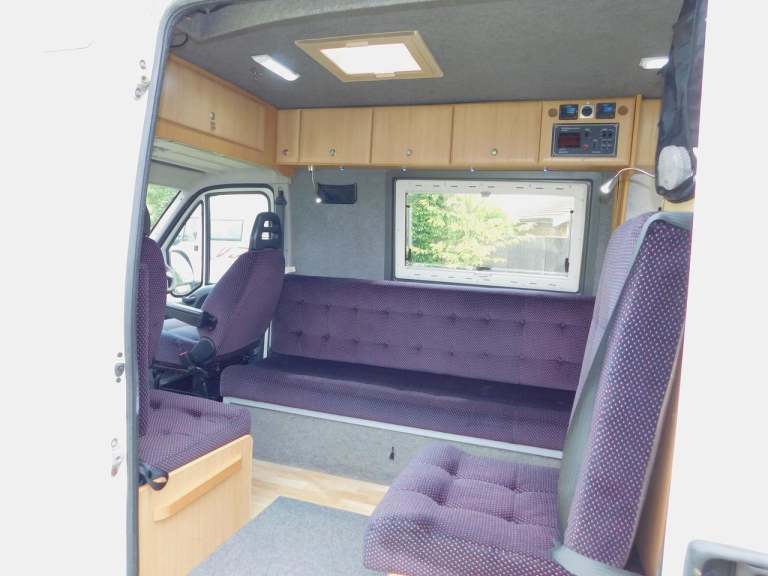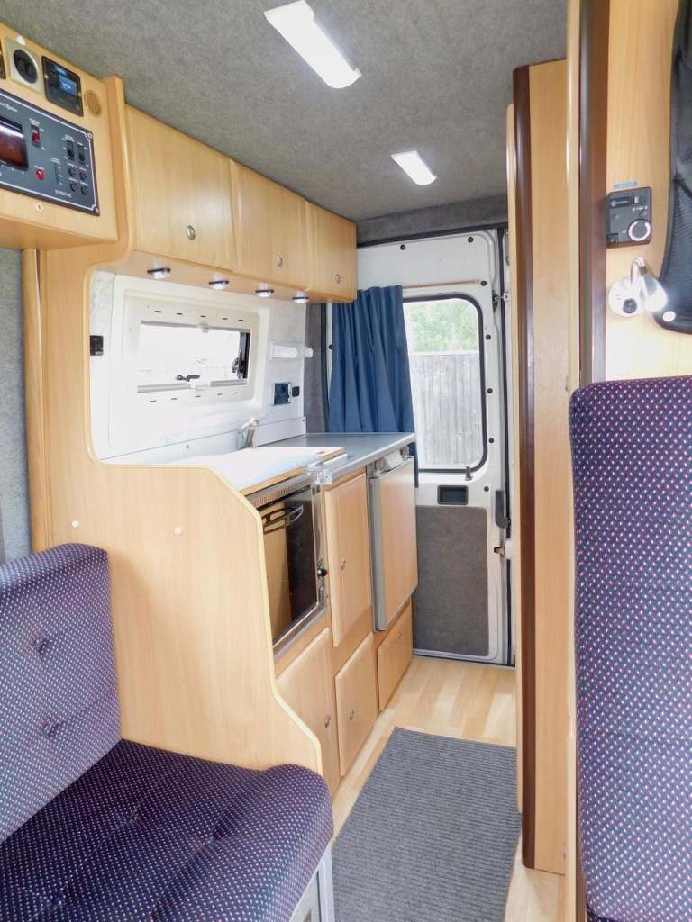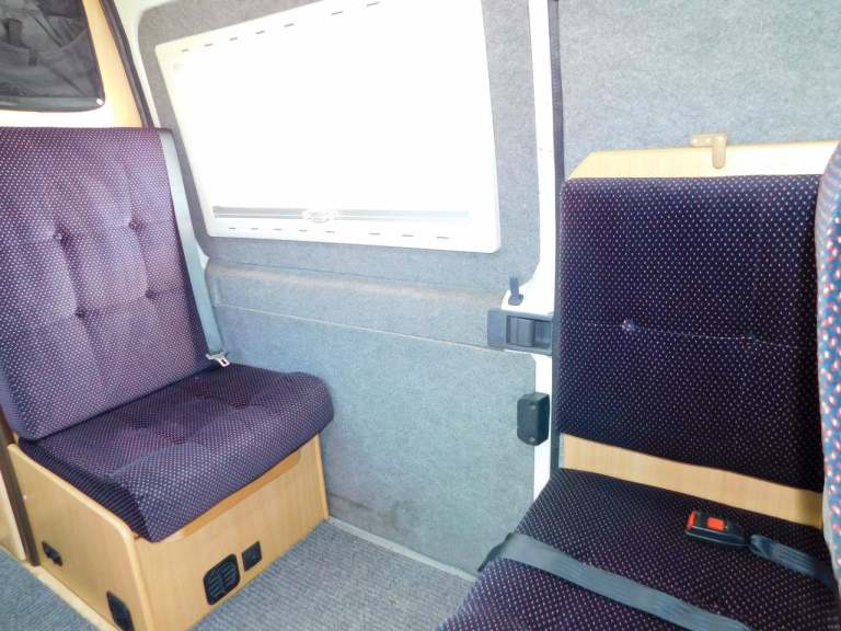 COMPLETE WITH END KITCHEN WITH A FULL OVEN & GRILL WITH 4 BURNER GAS HOB, 3 WAY FRIDGE, THE Shower Room HAS The SHOWER & a FLUSHING TOILET with a Thetford Cassette Plus a Drop Down Wash Basin. We have BLOWN AIR HEATING and Hot Water. The LONG SOFA BEHIND DRIVERS the DRIVERS SEAT MAKES UP TO A SINGLE OR DOUBLE BED. OPPOSITE WE HAVE 2 X TRAVELLING SEATS WITH SEAT BELTS, 1 X FORWARD FACING, 1 X SIDE FACING ALSO MAKES UP TO A SINGLE BED, OR TOGETHER MAKES A DOUBLE BED. The front Passenger Seat SWIVELS to become part of the LOUNGE and DINING Area. Indeed the large Dining Table neatly stores away at the back of the Campervan and can also be used Outside, perhaps under the Large Wind Out Awning…. We also have DOUBLE Glazing all round with built in Sliding Privacy Blinds and Fly Screens. On the Outside there is a Long AWNING, Roof Mounted Solar Panel and a roof Mounted Digital TV AERIAL. The SHIPPING LENGTH is only 5.99 METRES 2.05 METRES WIDE, GVW 3300 KG.. Only 88,000 miles from NEW..