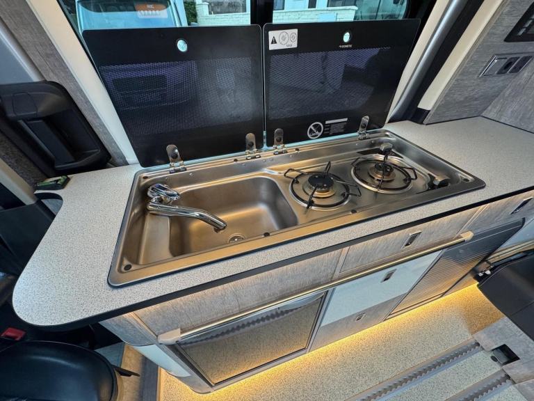 Fully equipped kitchen with 2-burner hob, sink, oven/grill, and 90L fridge