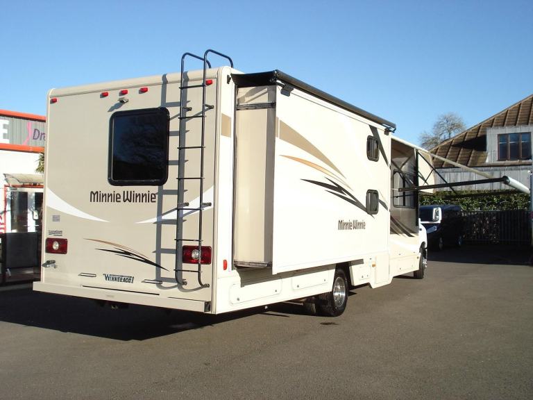 Winnebago 31H Minnie Winnie Bunkhouse with the following spec. Two huge slide outs with slide toppers. Ford E450 triton Petrol with Long range LPG conversion. 6sp. Auto torque shift . Various outside roto cast lockers plus rear through locker. Sleeps 8/9 with Rear East west Queen island bed in end bedroom. Ample storage cupboards and wardrobe space. X2 full size bunk beds. Good size shower room with W.C. and vanity wash basin. All laminated type flooring. Kitchen area with all fitted appliances. Bed settee and dinette Plus huge over cab bed. Seat belted throughout.Ice cold roof air conditioning. Thermosticly controlled central heating Fitted security safe. Front area 32”T.V Full 110/240/12v electrics with on board 4 KVA Onan generator. Reversing camera. Cold air cockpit air conditioningUK spec. Tow hitch. Elec Sun awning. Beach shower. One private USA and one private UK owner. All manuals and documentation history from new. Insurance approved alarm immobiliser. Fitted tracker. Perfect set up for familly long term living.