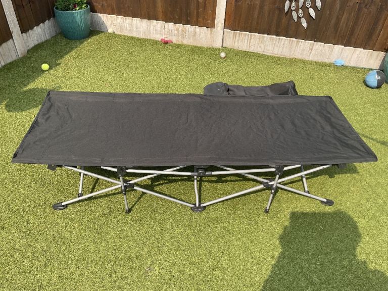 Fold up camping bed with carry bag. Size width 70cm (27.5in) length 190cm (75in). Height from floor 40cm (17in)