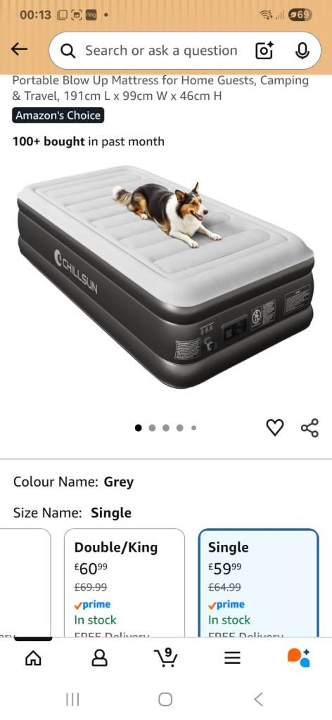 Single Readybed air bed 170cm x 70cm and battery operated pump. Includes storage bag.