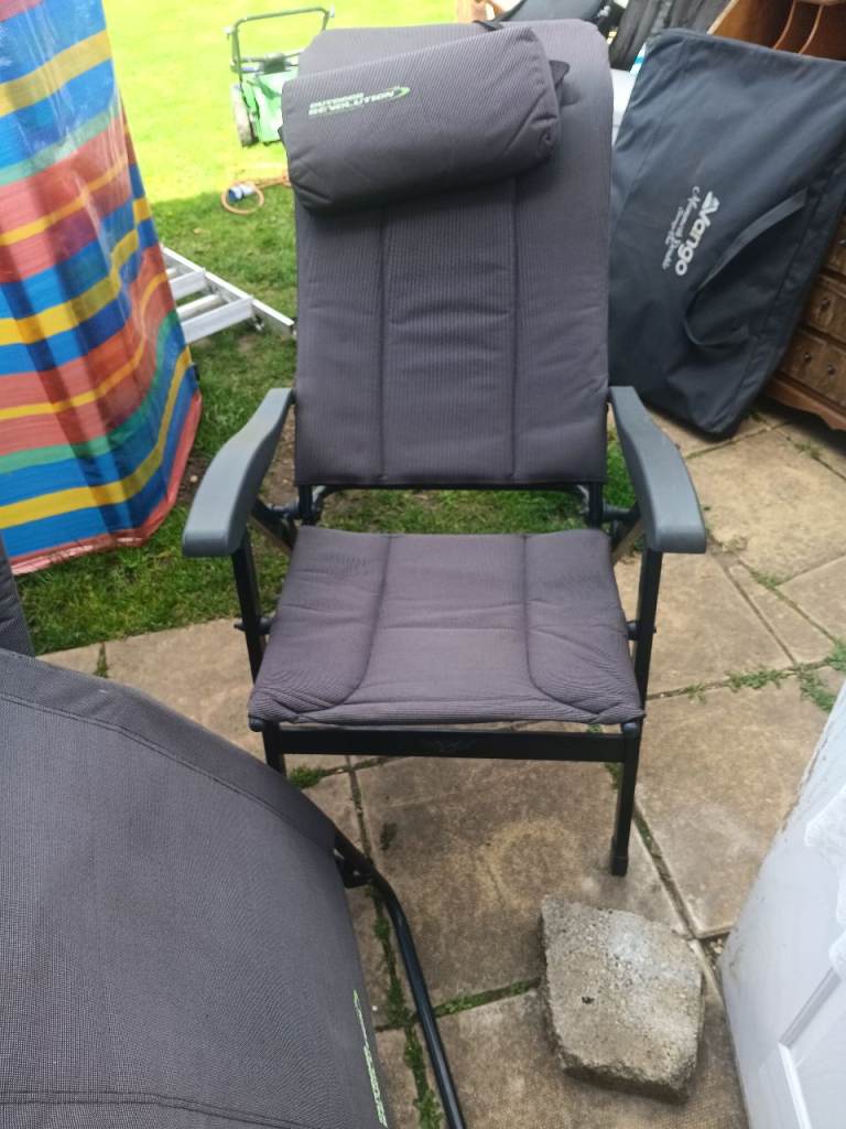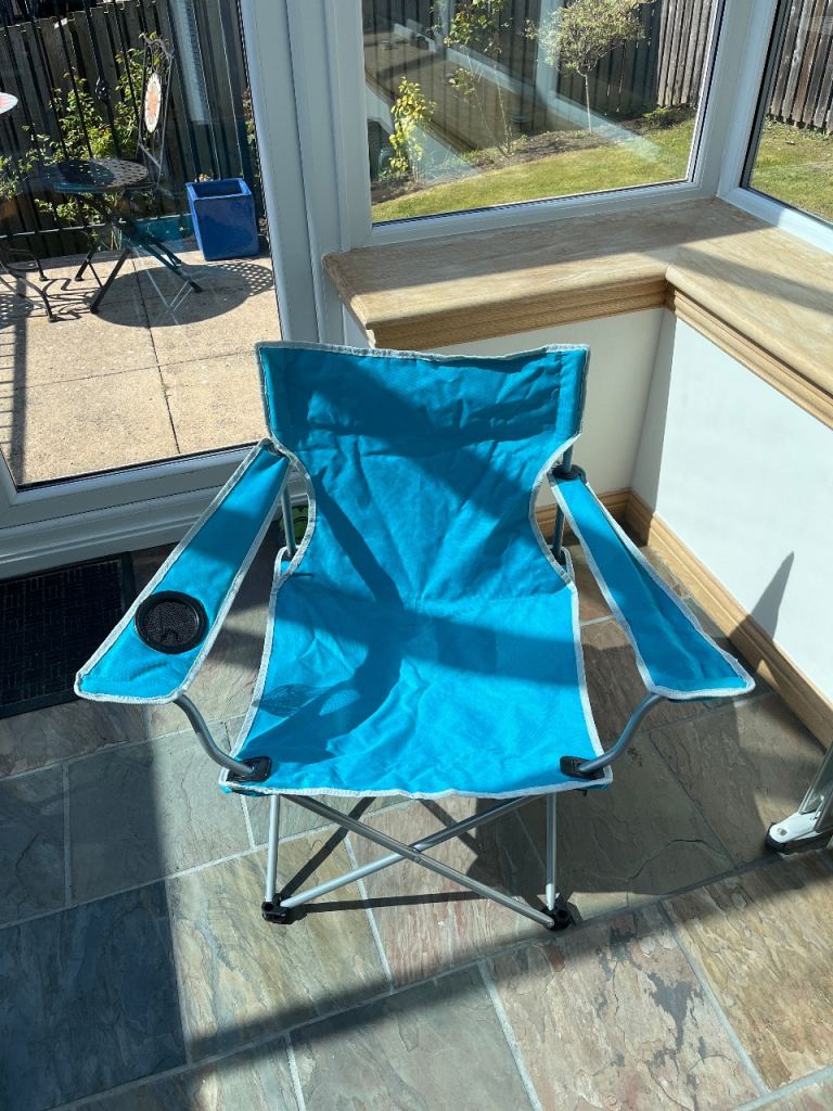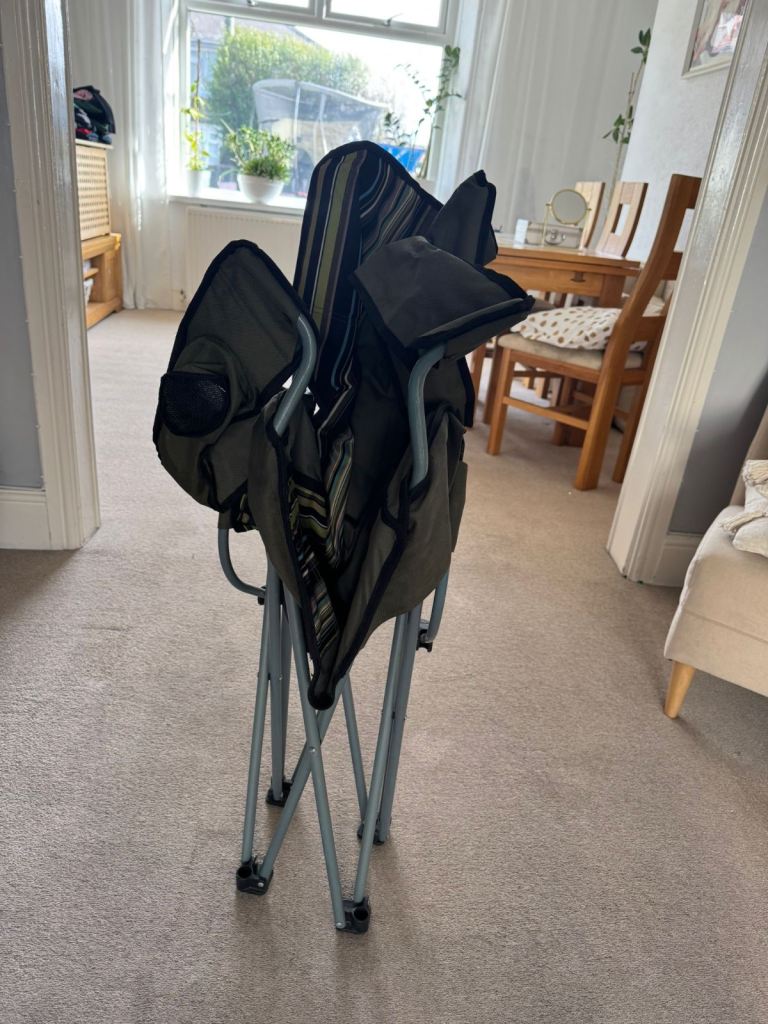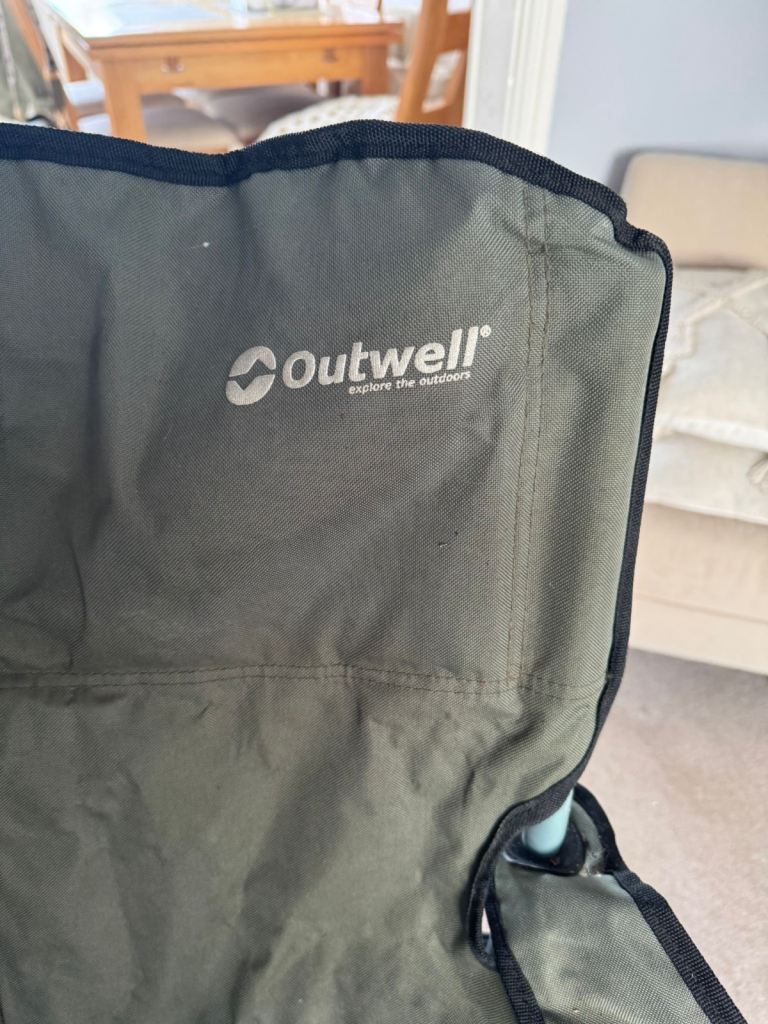 Comfortable foldable camping chair by Outwell, perfect for outdoor trips, festivals, or relaxing in the garden. Features a sturdy metal frame, supportive fabric seat with stylish striped detail, and padded armrests for extra comfort. Lightweight and easy to fold away for storage or transport. In good used condition