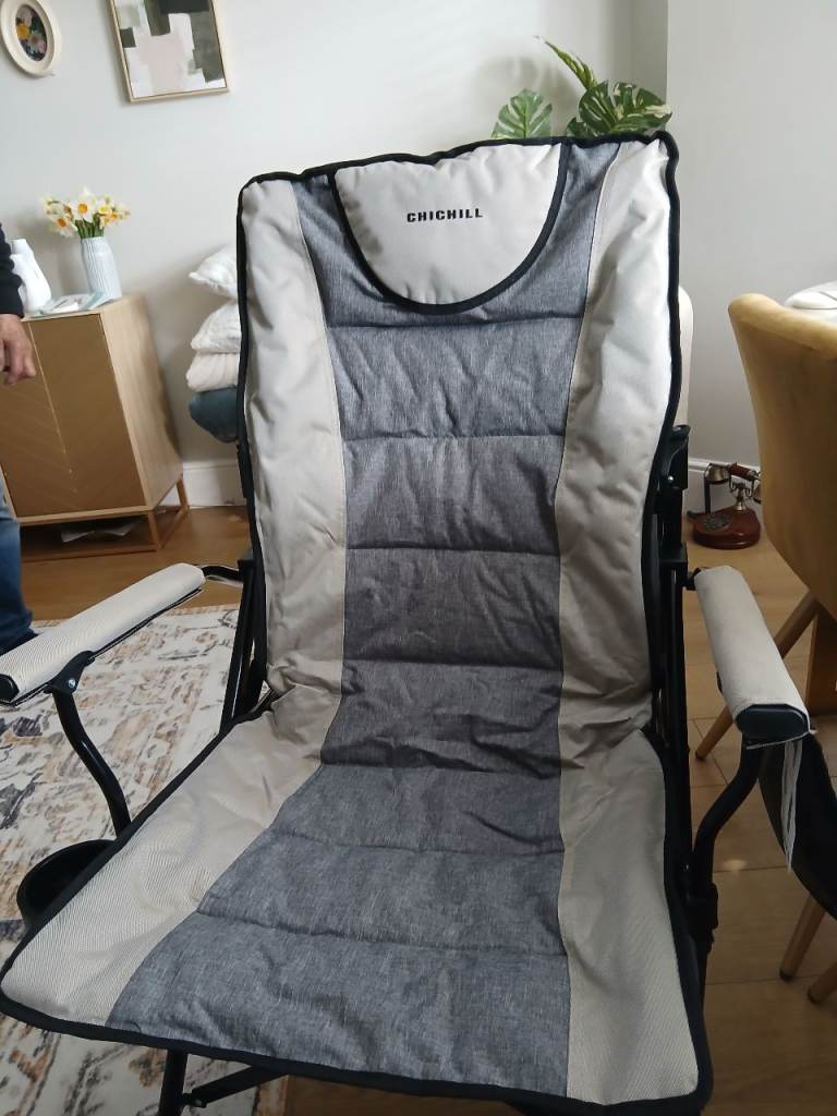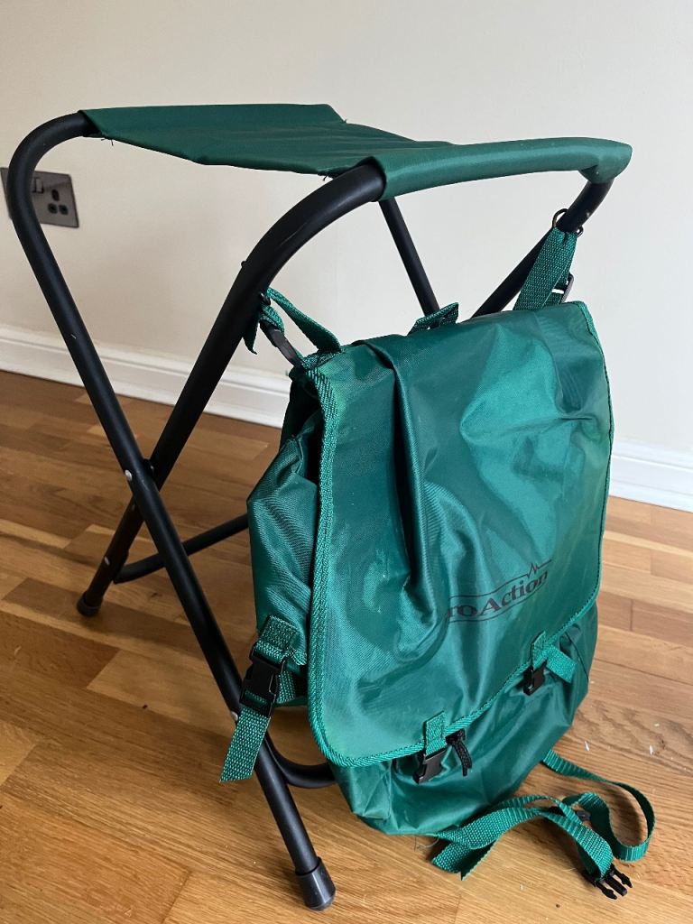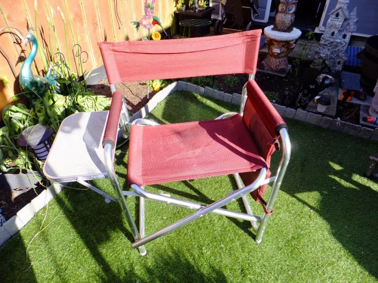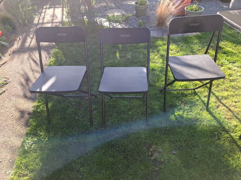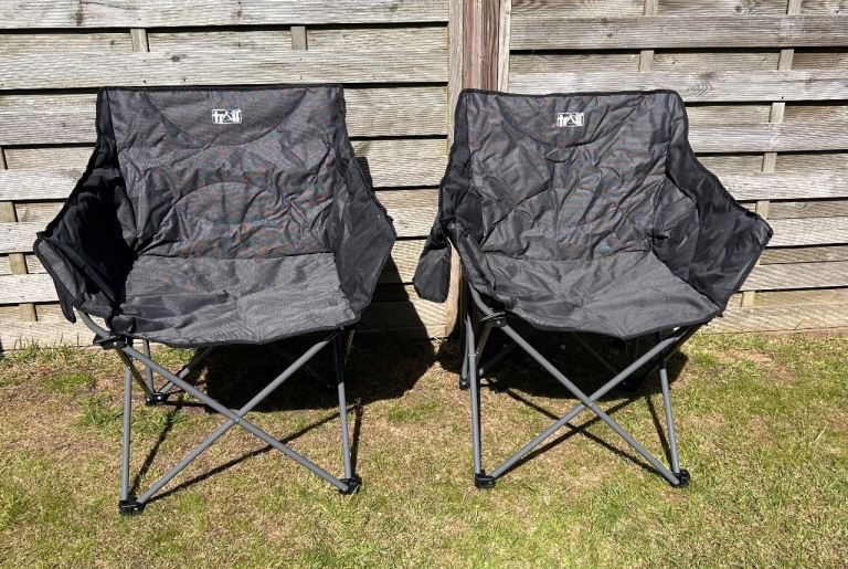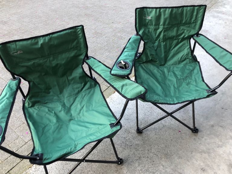 Comfortable foldable camping chair by Outwell, perfect for outdoor trips, festivals, or relaxing in the garden. Features a sturdy metal frame, supportive fabric seat with stylish striped detail, and padded armrests for extra comfort. Lightweight and easy to fold away for storage or transport. In good used condition