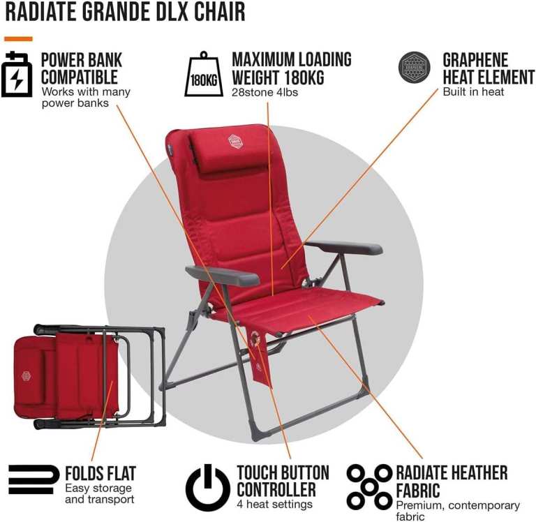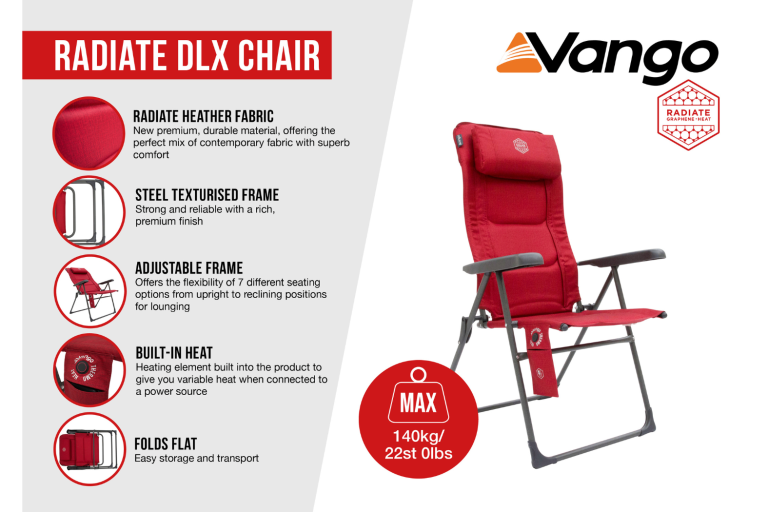 Perfect for those chilly days, cold autumn or winter months when you want to explore and have adventures but you want to remain warm and cosy, The Vango Radiate DLX Chair chair is sure to keep you warm on the campsite, fishing or wherever your adventure takes you as it features an innovative, built-in Graphene heating element, therefore allowing you to heat your chair when connected to a power source. Compatible with many power banks, the Radiate DLX chair will add a touch of luxury to your camping/fishing kit. therefore with its high quality fabric, 7 seating options and padded seat and backrest, you will be the envy of other campers on those chilly evenings on the campsite.
