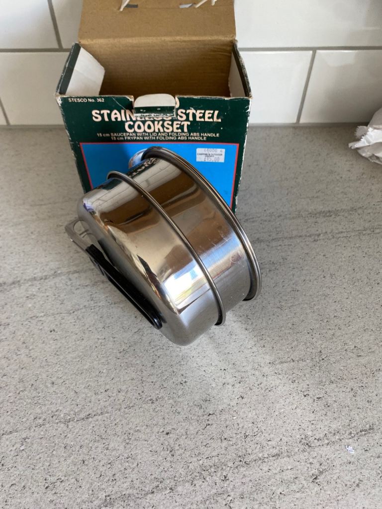 A brand new , never been used stainless steel camping saucepans, 6" with folding handles, will send but buyer to pay extra for postage