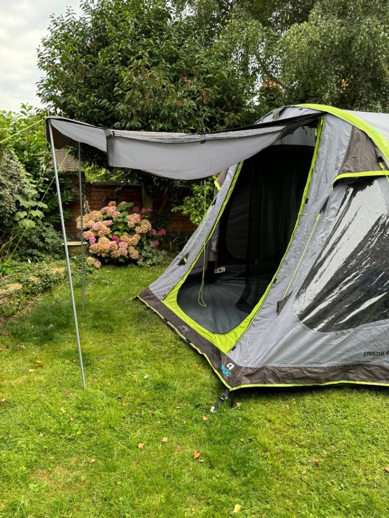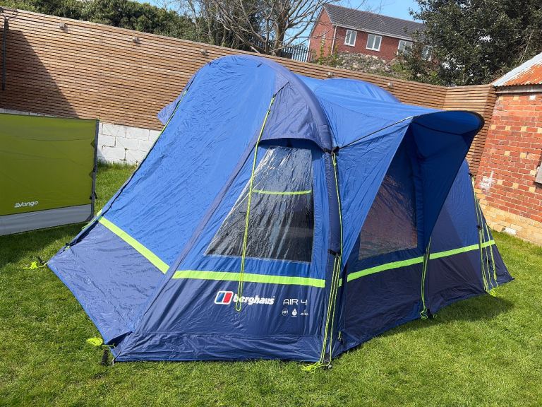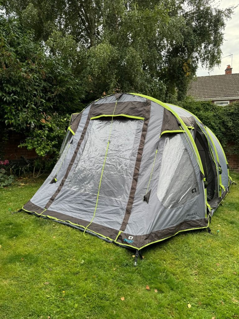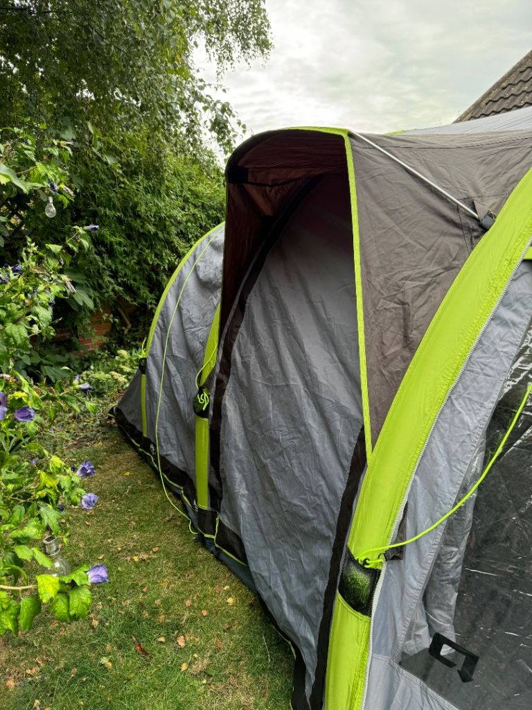 A large 4 person inflatable tent . Inflates in five minutes. Great condition. With footprint, carpet , loads of heavy duty pegs , pump. Poles for awnings. Also included is a new never used tent porch . Also inflatable .