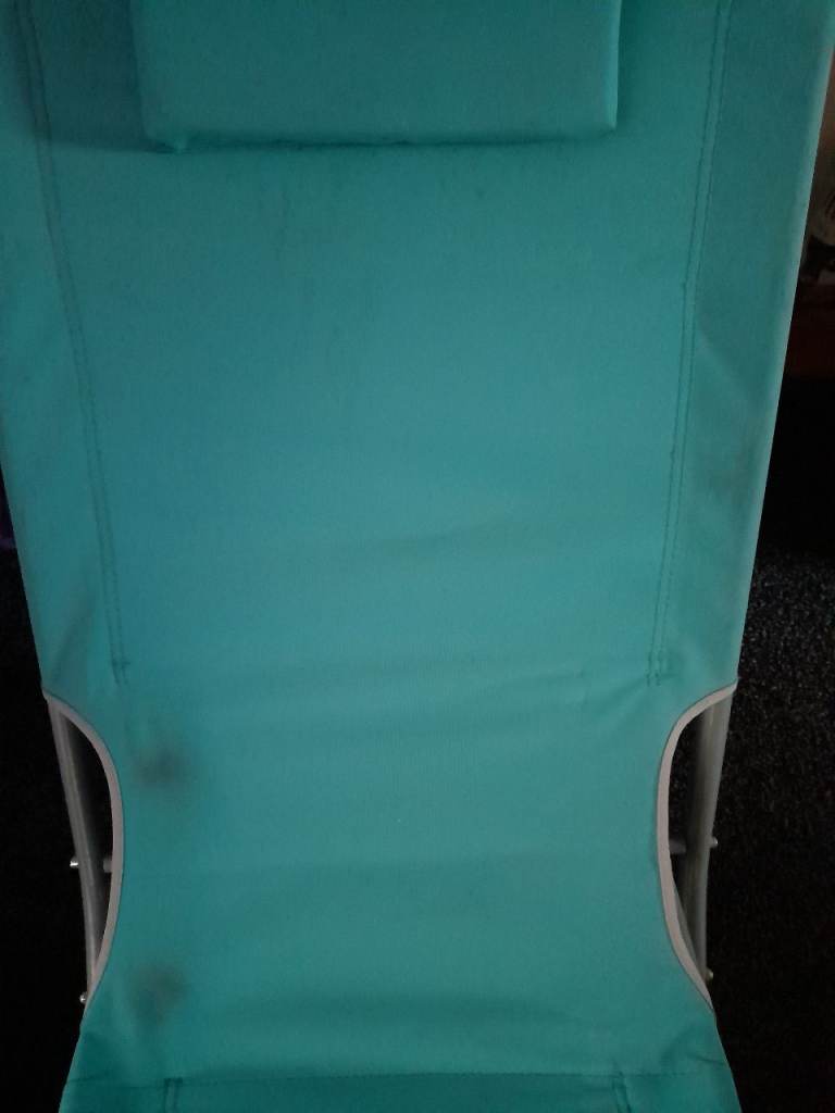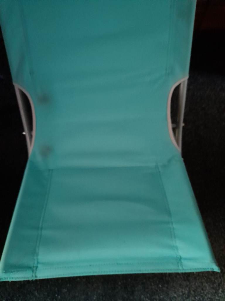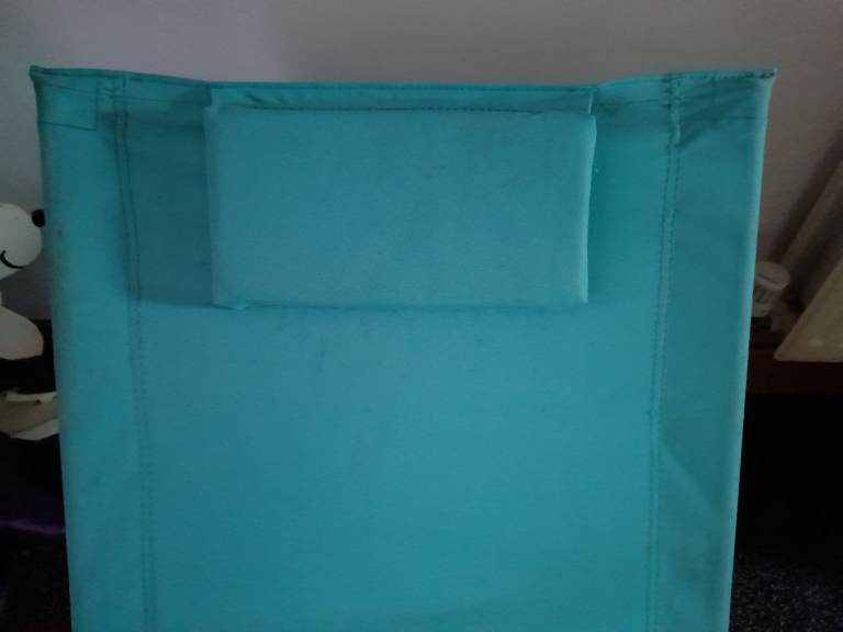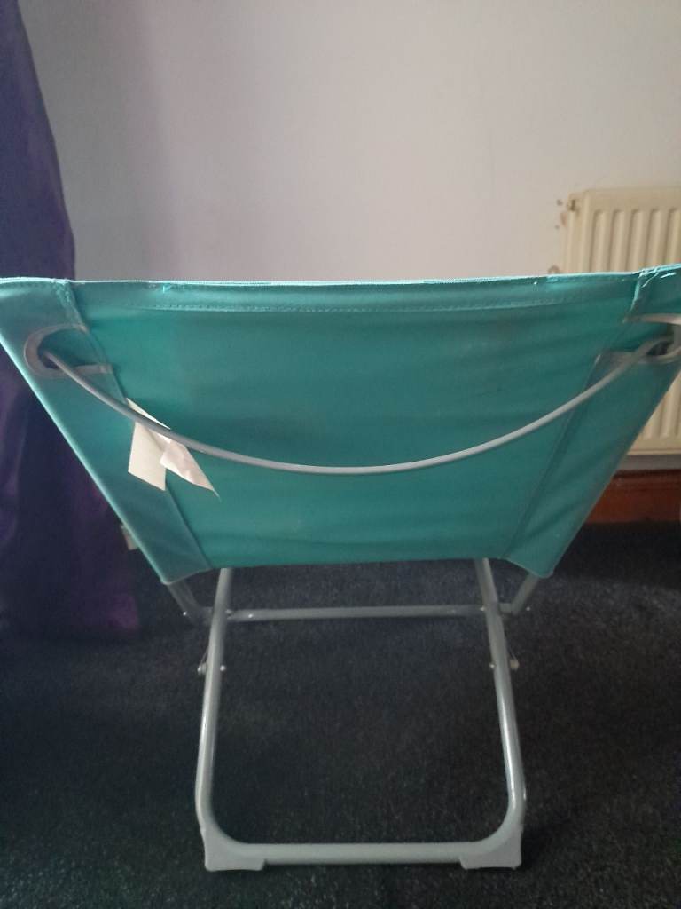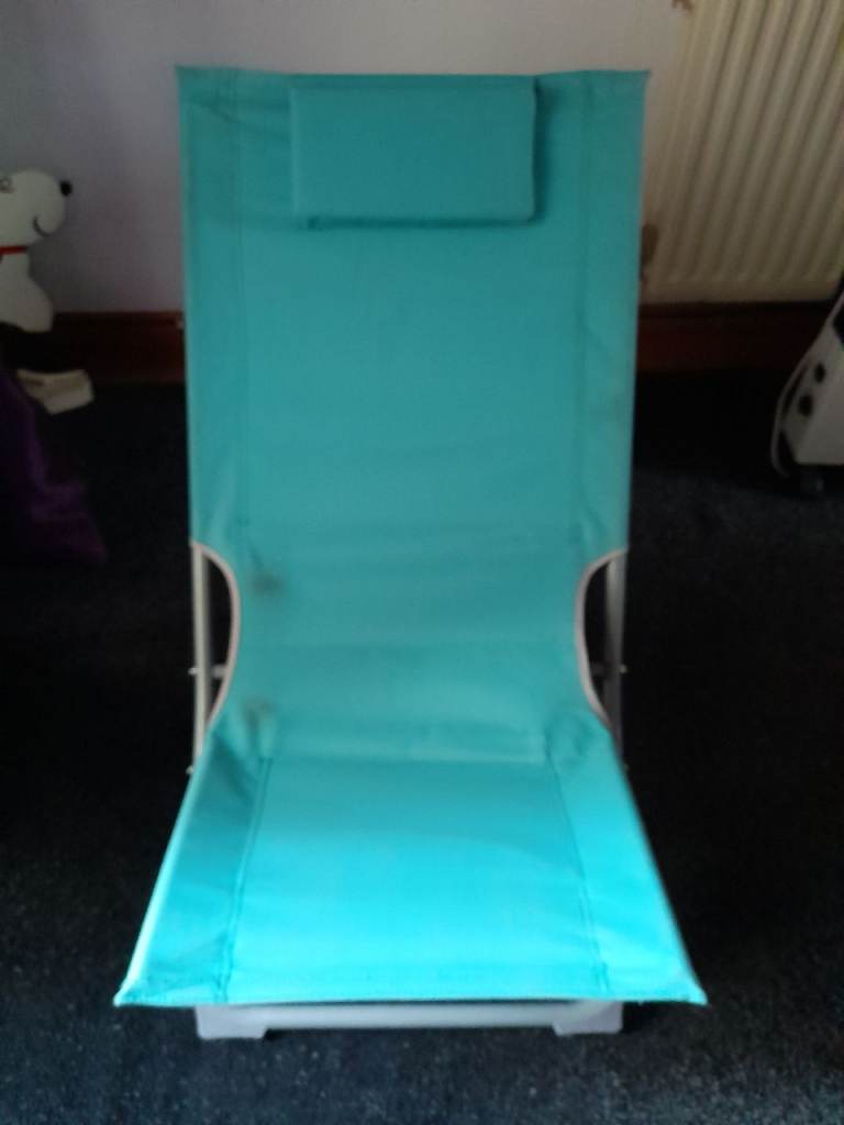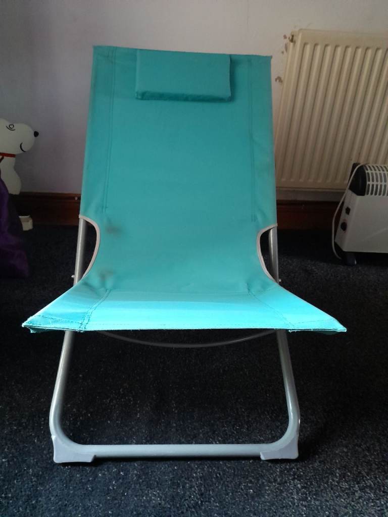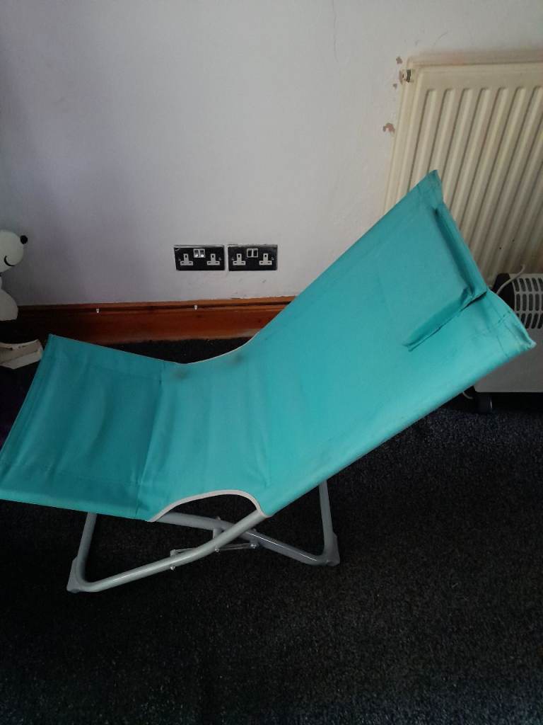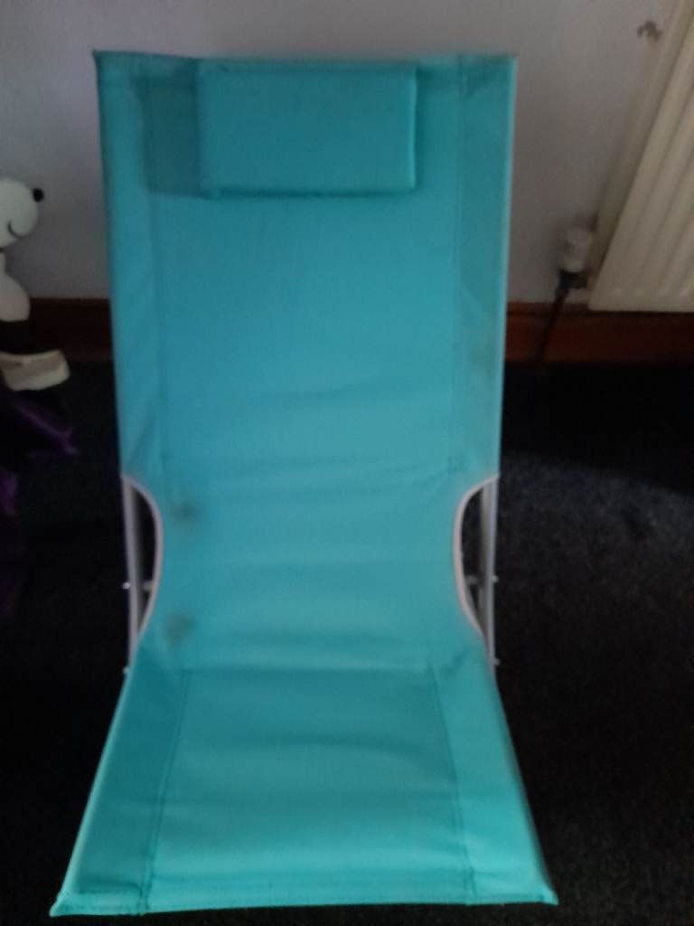 Blue Reclining Fold Up Chair. B & Q. Padded Head Rest. No Arms. Adult Size. Back Carrying Handle. Sturdy. In Good Condition. If you can see this Ad it is still for Sale. Text if interested.