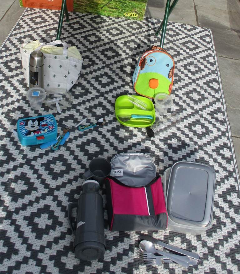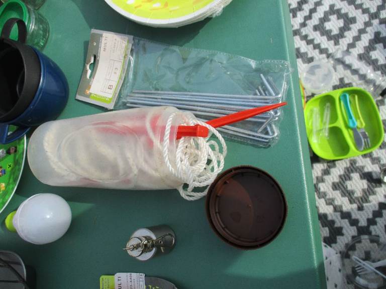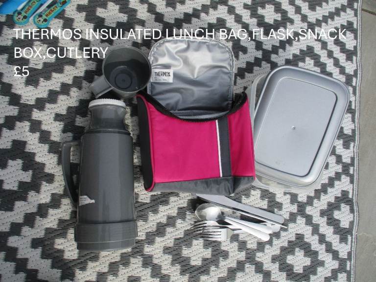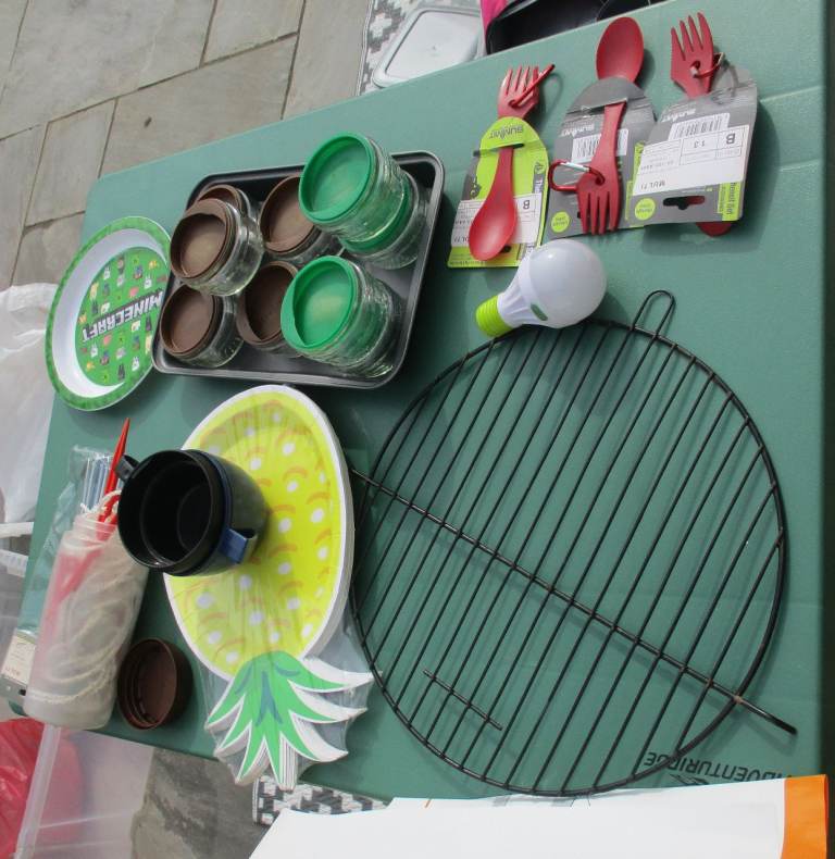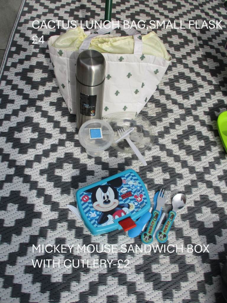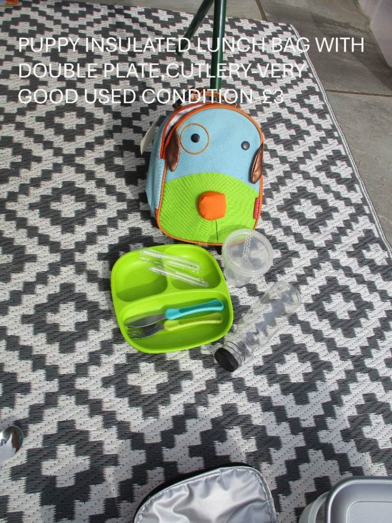 Bundle of camping/picnic bits-mostly new, the glass ramekins have utilised covers-not fitted lids,just to keep bugs away.£8 all. Lunch bags/box-all used once or twice or unused-prices on photos.Collection only from Gillingham dorset