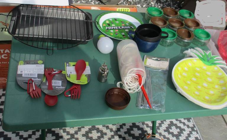 Bundle of camping/picnic bits,ground spikes,grill pan,paper plates etc,Lunch bags/boxes
