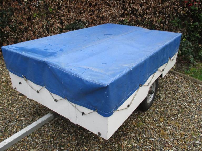 Camping trailer 6ft x 4ft, steel chassis, Mini car wheels & hubs for higher speeds, Alko style rubber suspension, 2 nearly new tyres & spare wheel. Wooden sides. Wooden top opens and forms 2 off-floor beds if required inside large tent. Interior fitted with lockers & front panel slides out for easy access to carpeted well. Drop down legs at corners to level. Heavy duty cover. Extended tow bar enabling sailing dinghy to be top mounted. Attachment position for lights & number plate panel. Effectively a multi-purpose trailer. Garage stored until advertised. £435