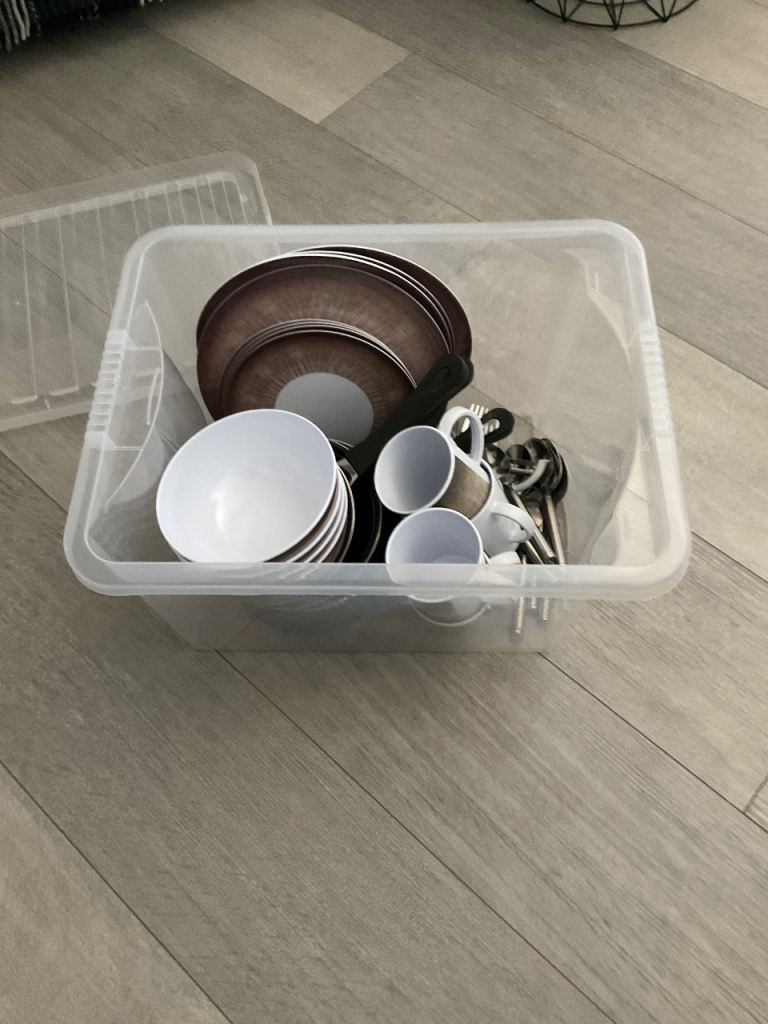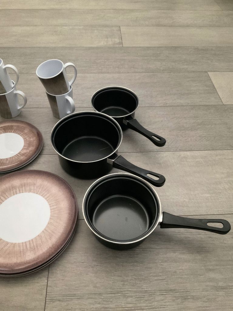 Bundle for cooking caravan/camping includes 16 piece melamine set, includes 4 dinner plates, 4 side plates, 4 bowls and 4 mugs also cutlery, potato peeler and pots . Plastic box included. Collection only Kelty.