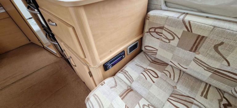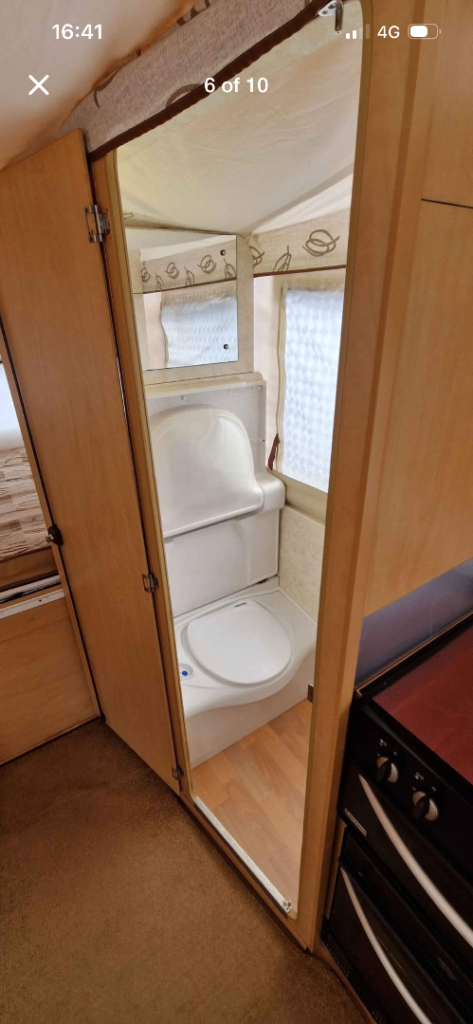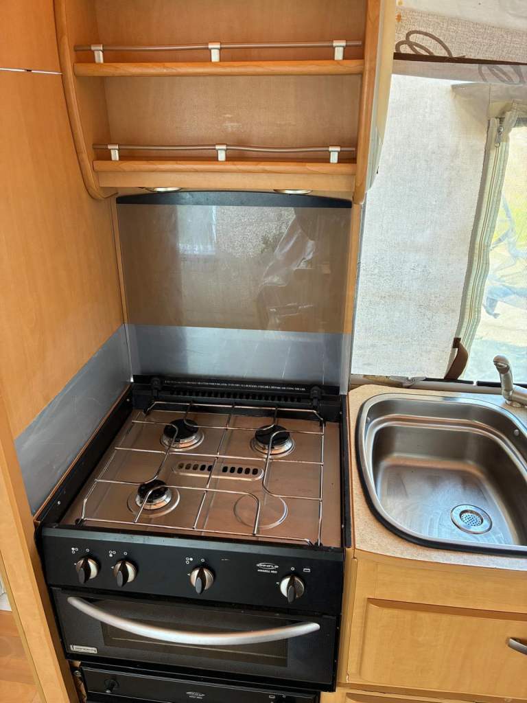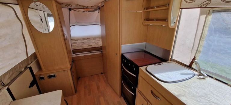 It has an electric flush cassette toilet with fold- down basin, gas kitchen and electric/gas fridge.