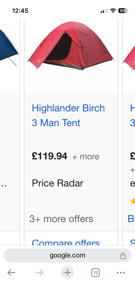 Brand new and unused. Good reason for sale. Highlander Birch three man tent with extras comprising footprint groundsheet and 20 ultra strong pegs.