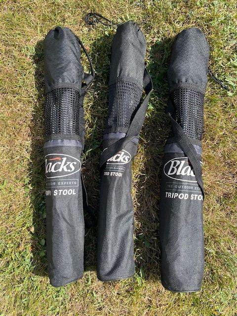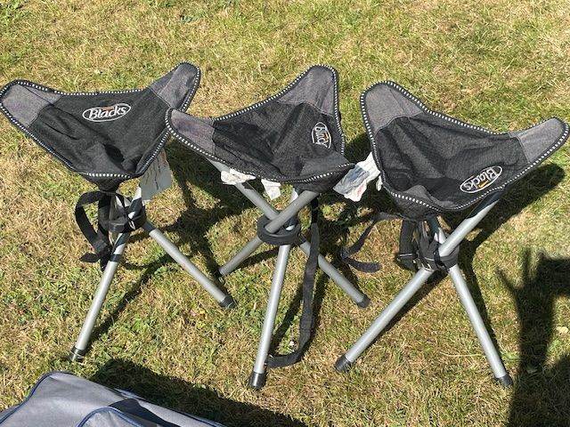 3 x Blacks folding stools. 46cm high. Max weight 102kg. Come in their own carrying case with handles