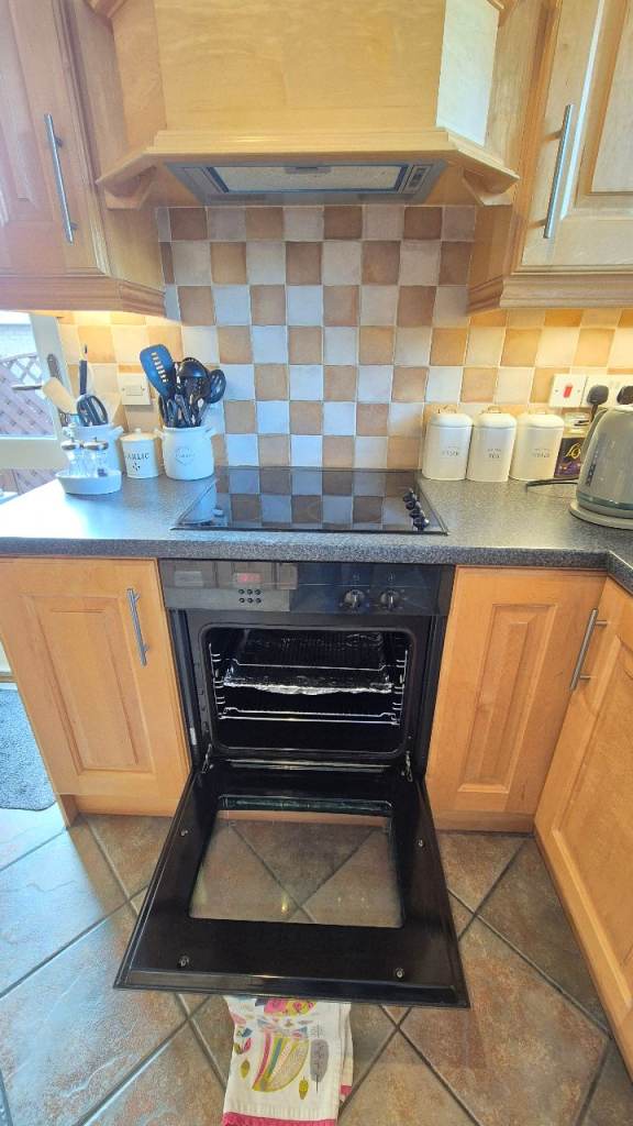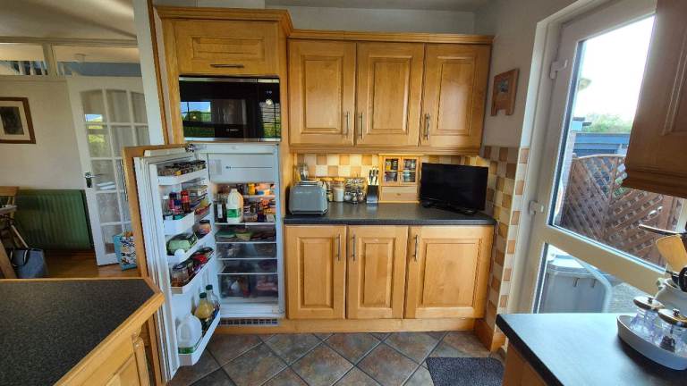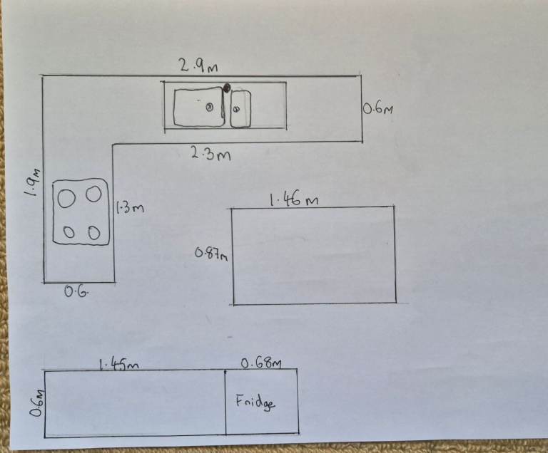 This 23 year old solid maple kitchen is for sale. It is to be professionally removed on Monday April 13. Good condition and includes Bosch Fridge, Oven, Hob and Cooker Hood as well as sink, tap and lighting. DOES NOT INCLUDE microwave or freezer. Approximate measurements shown in diagram.