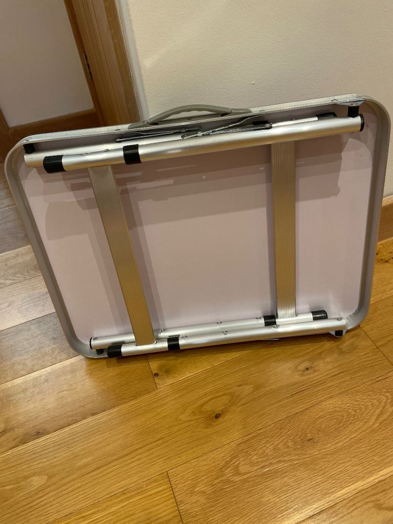 An aluminium folding table with carry handle. Lightweight.