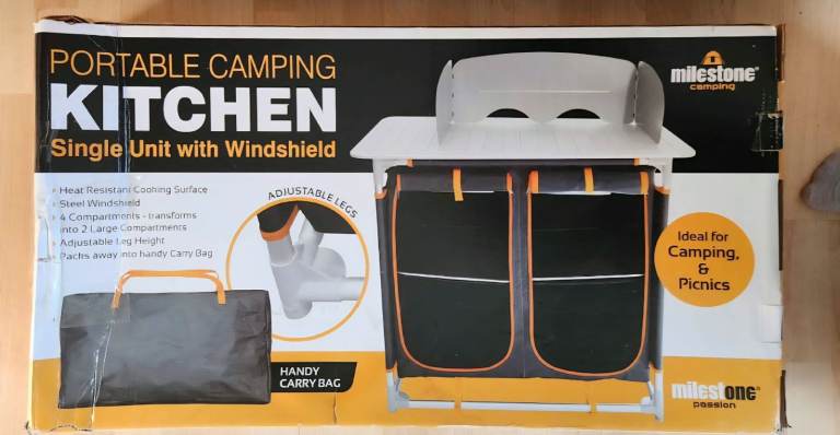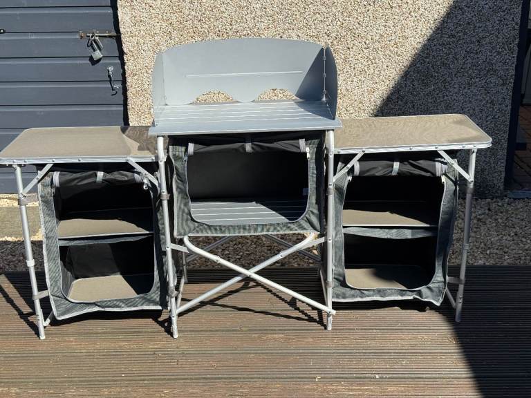 Camping table with under storage, accessible from both sides via 4 zipped doors, 2 adjustable height settings.