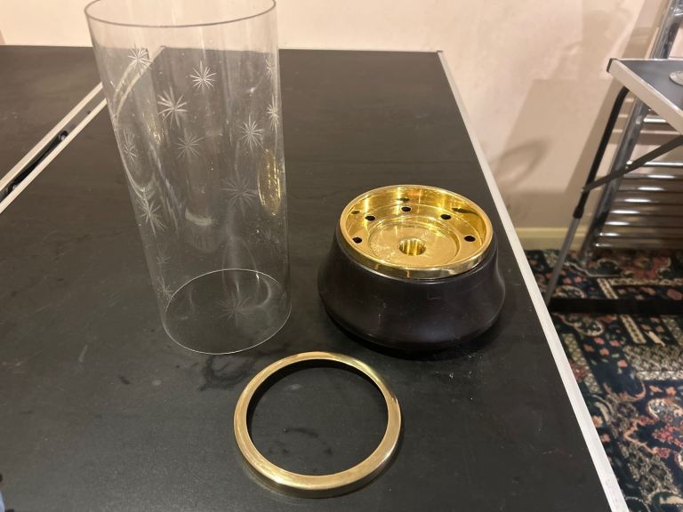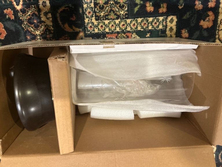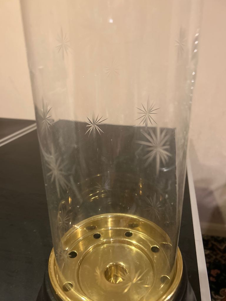Cut glass I think it's a candle holder, never been used.heavy base still in original box think it's about 30 years old