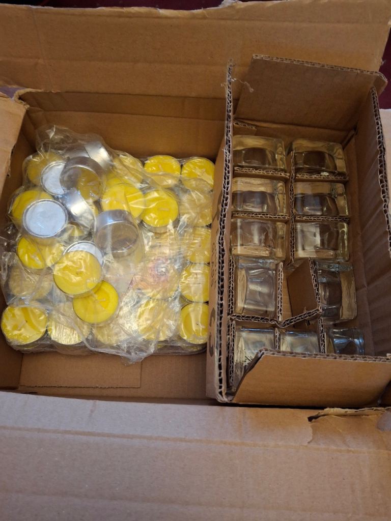 80 citronella candles & 10 glass holders as shown. Must go, buyer to collect.