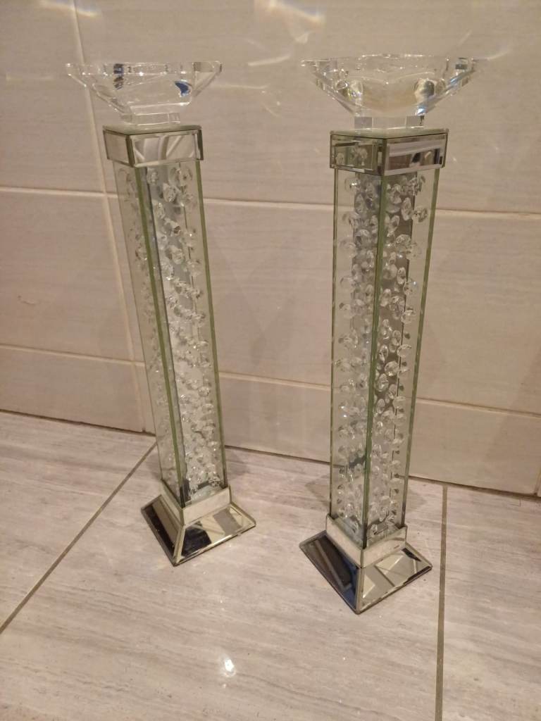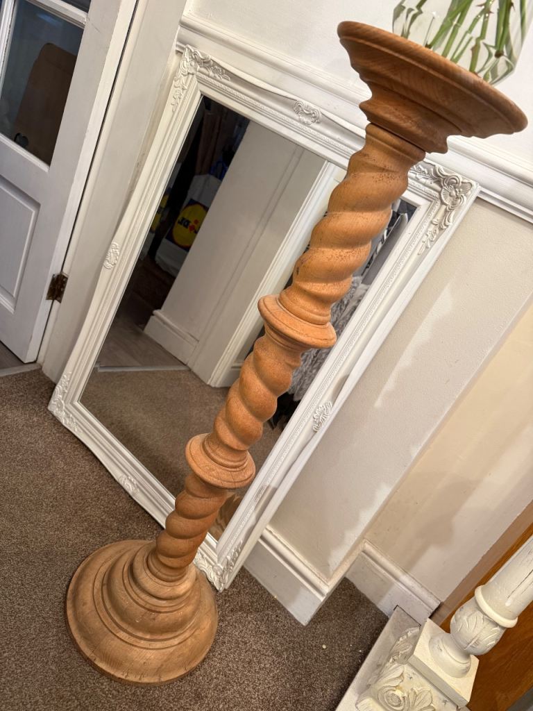 Solid wood, comes in two pieces collection portishead. Very sturdy 37.5 inches high, base 11 inches top 9 inches. Gorgeous piece