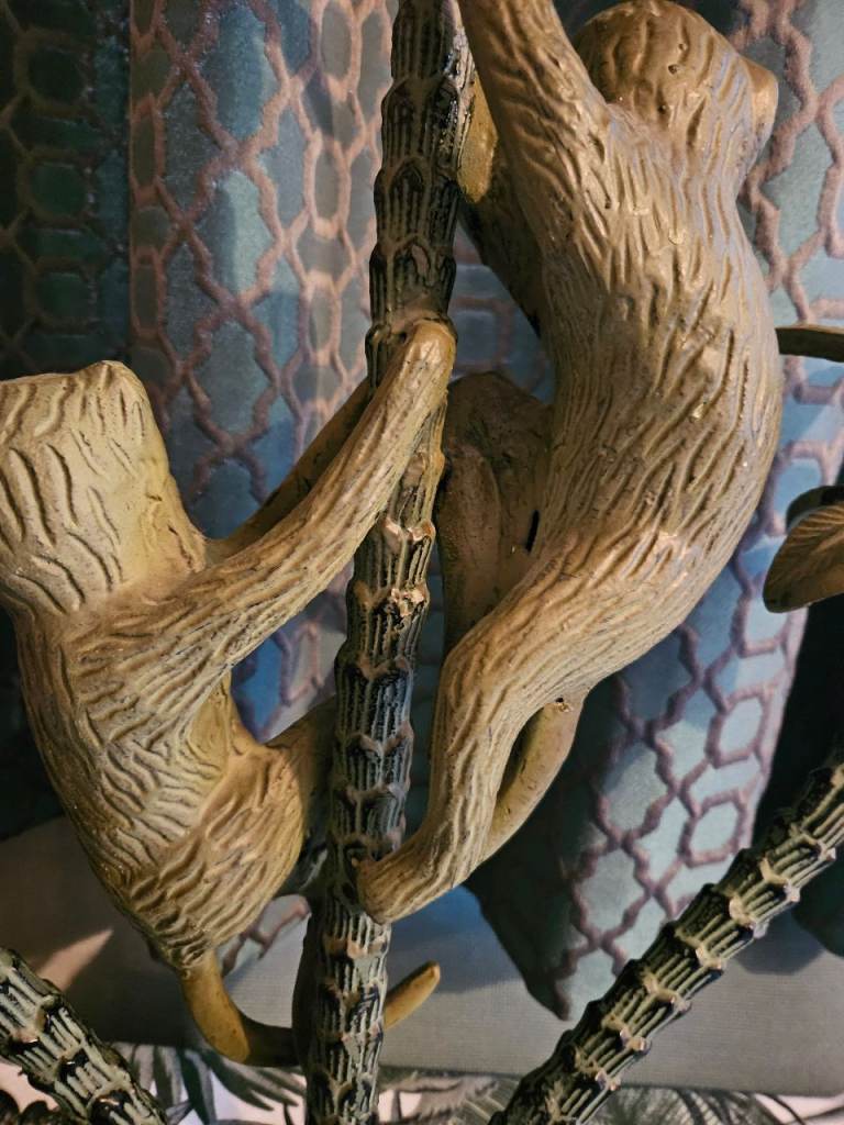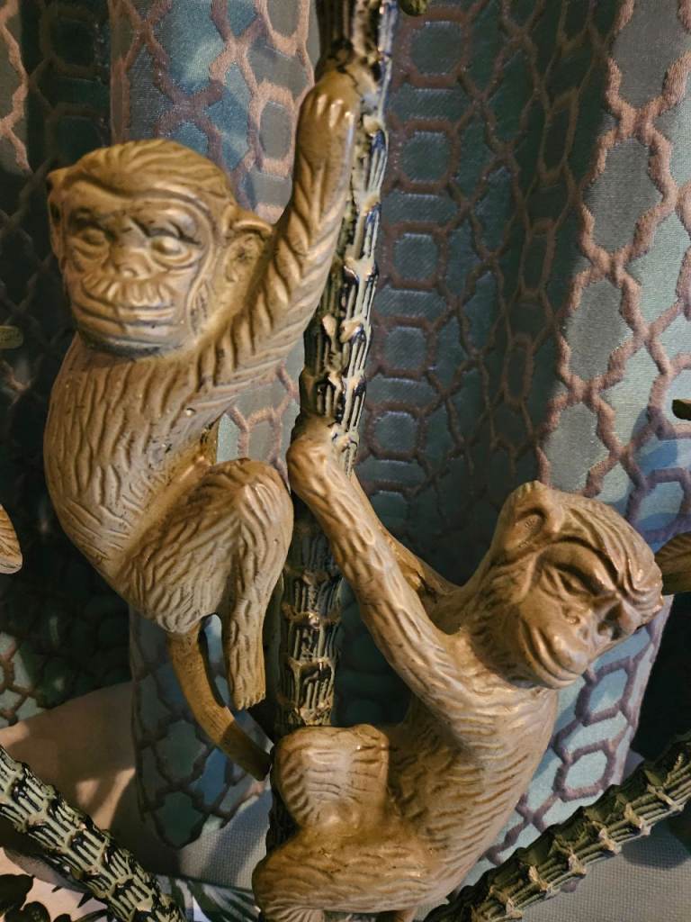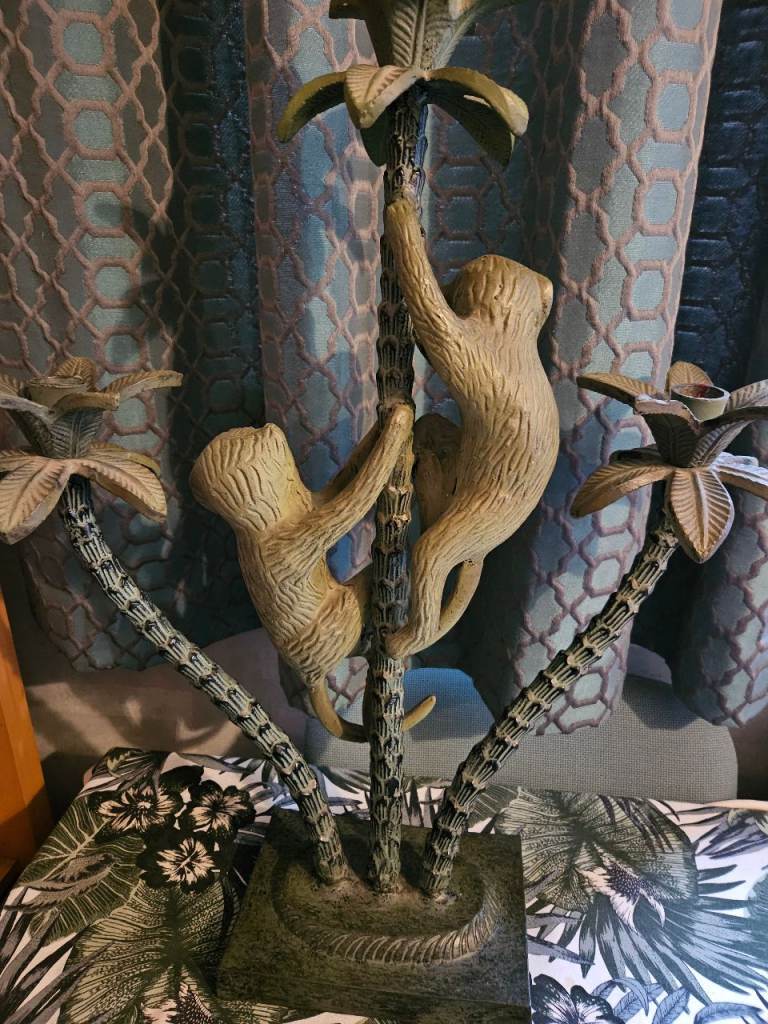 Large green metal vintage style art deco palm tree monkey candle holder candelabra