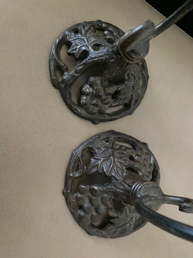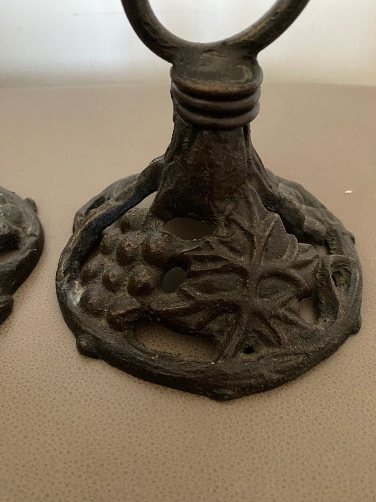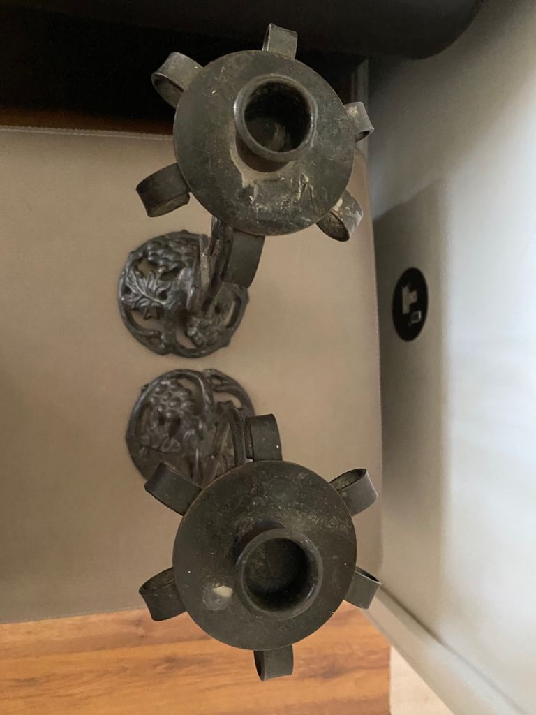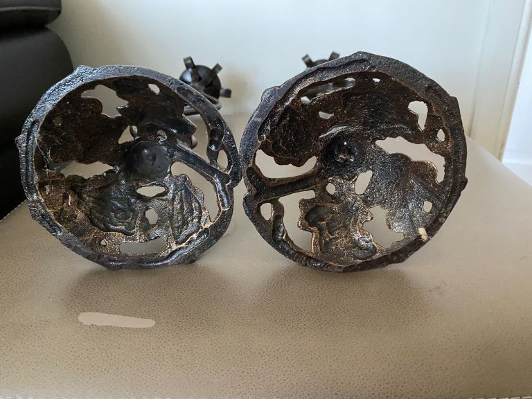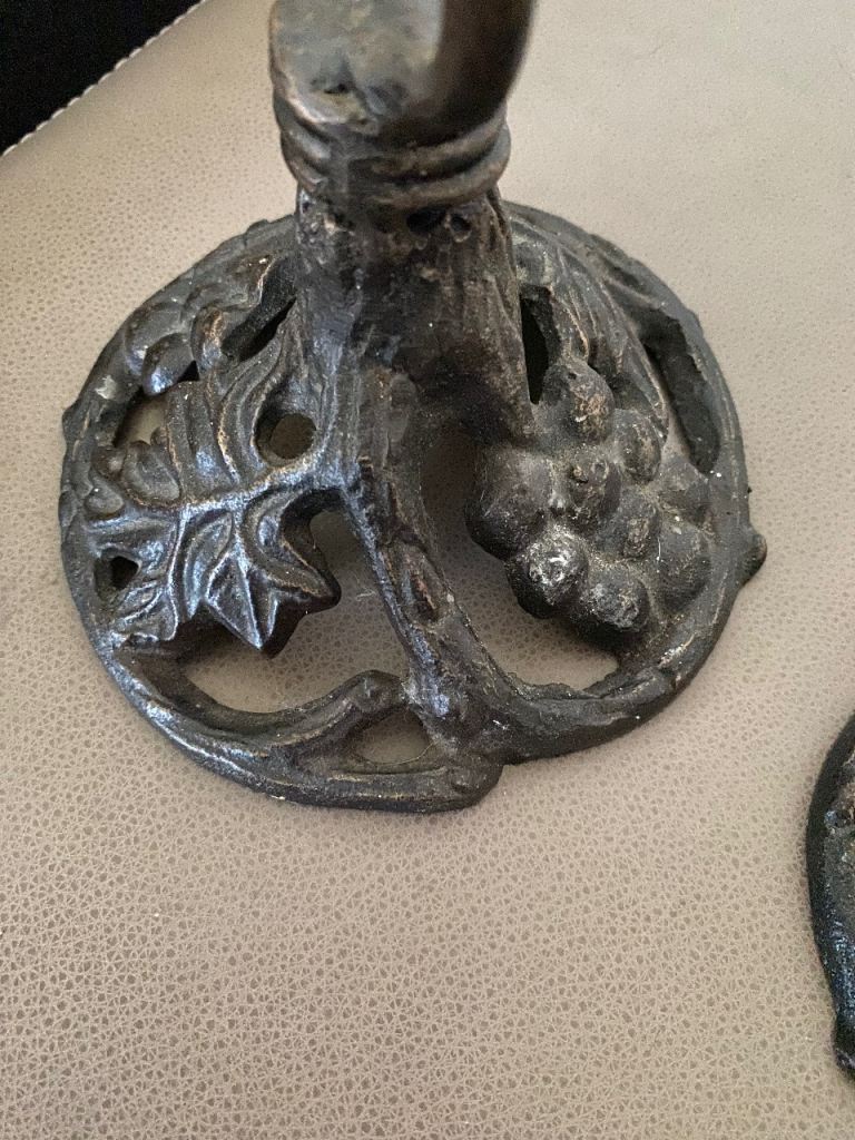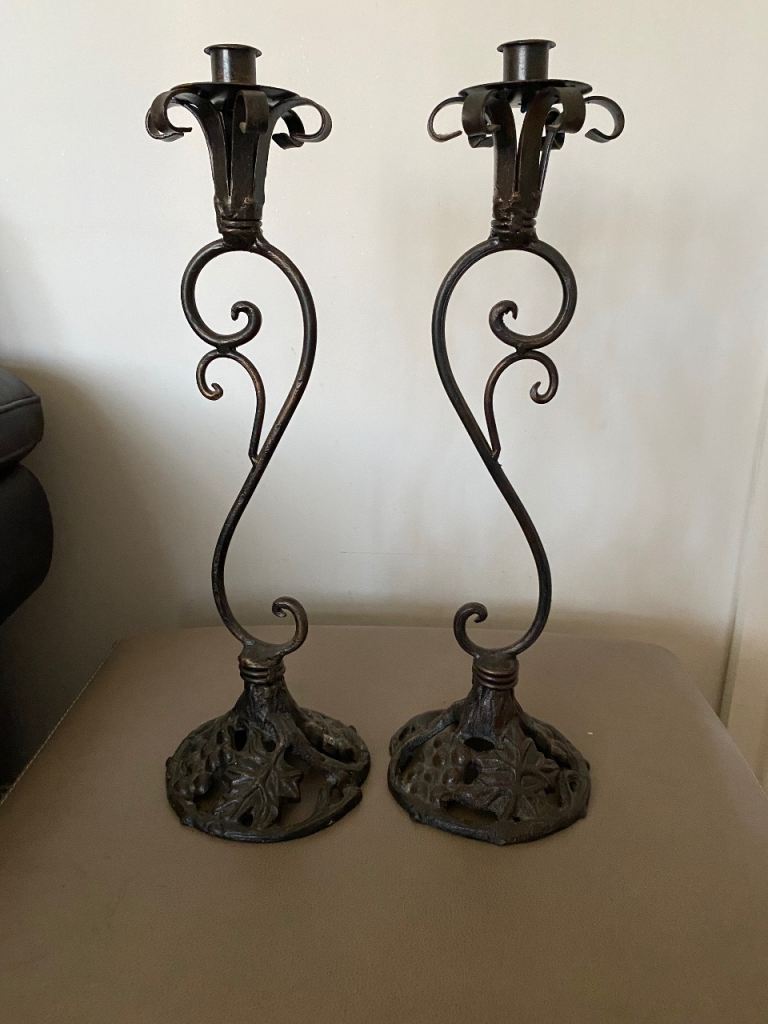 A pair of metal (not sure if wrought iron or not) candlestick holders in good condition apart from a bit candle wax on them. Height is 44 cm and width of base is 14cm. Collection only from Battle Hill Estate Wallsend