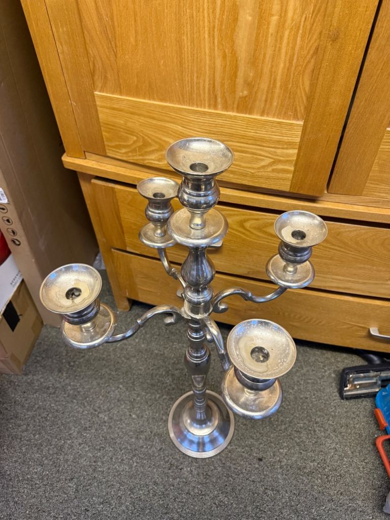 Decorative silver-coloured 5-arm candelabra. Solid and heavy with classic design. Used condition with signs of candle wax; would benefit from a clean/polish.