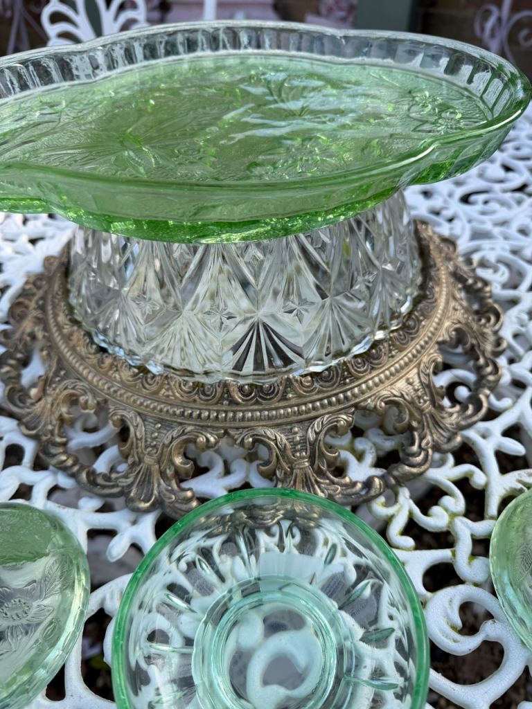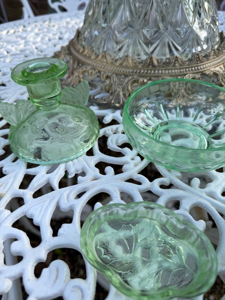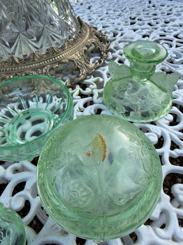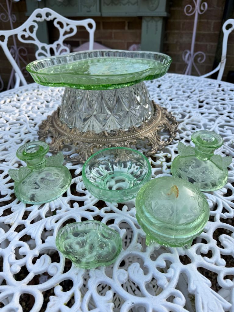 Sowerby green pressed glass dressing table set, Art Deco Era 1930's / 1940's